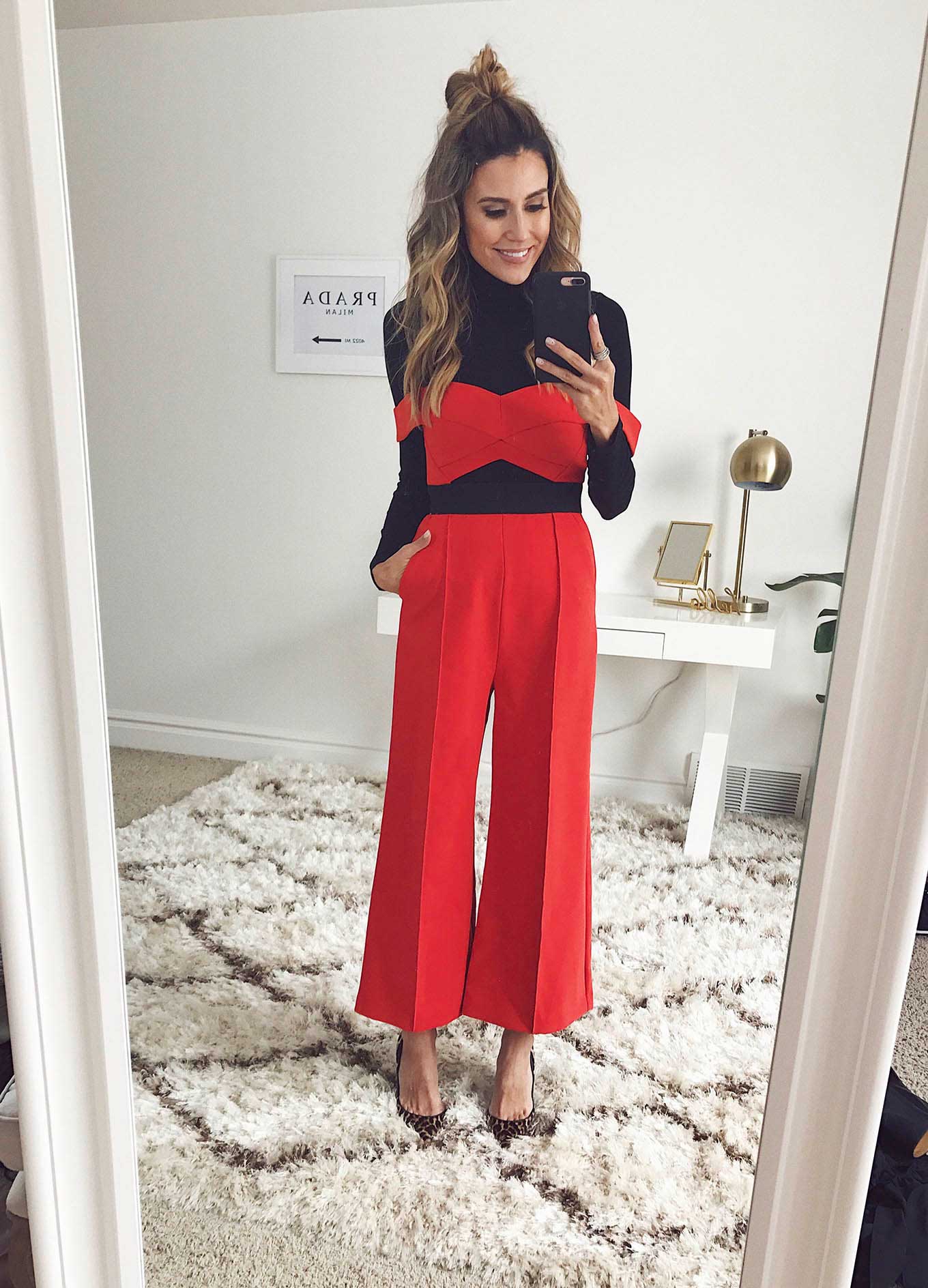 DETAILS: BLACK TURTLENECK | RED JUMPSUIT (ON SALE – 40% OFF) | LEOPARD HEELS