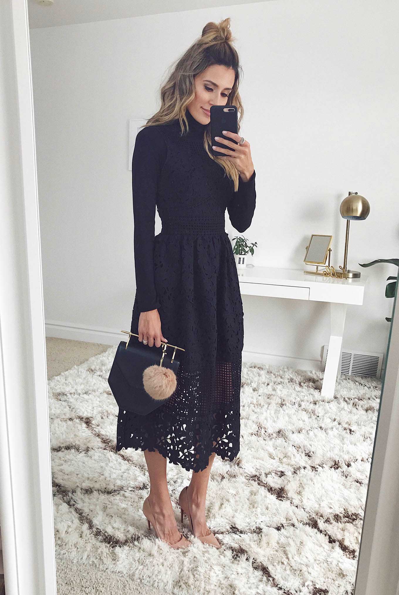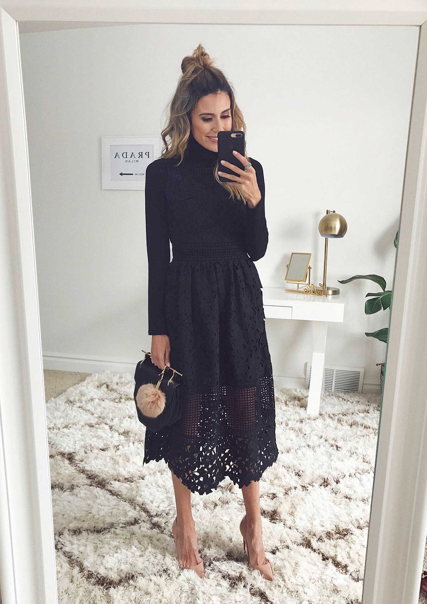 DETAILS: BLACK TURTLENECK | BLACK LACE MIDI DRESS (SIMILAR HERE UNDER $100) | NUDE HEELS | BLACK CLUTCH | FUR POM