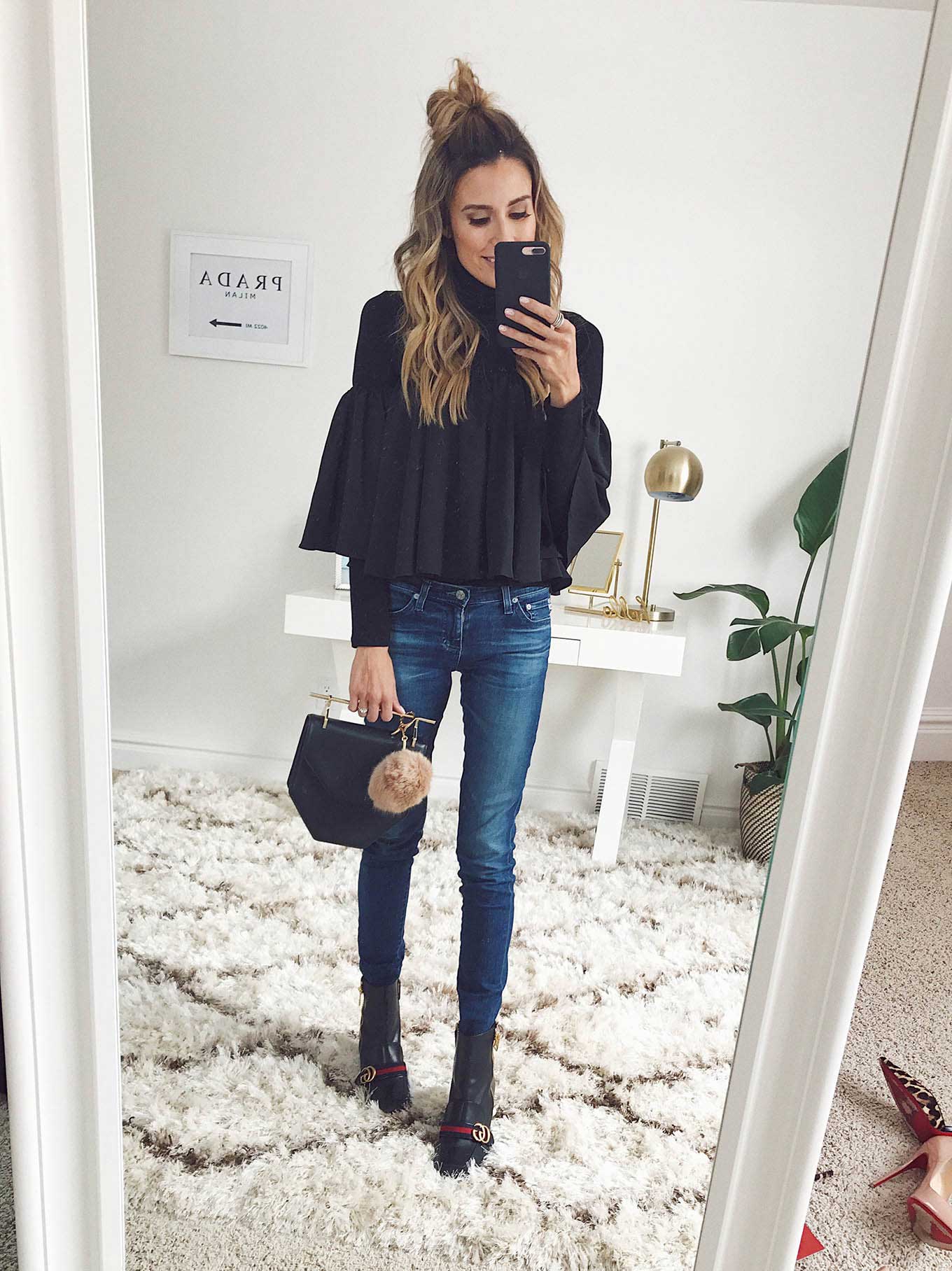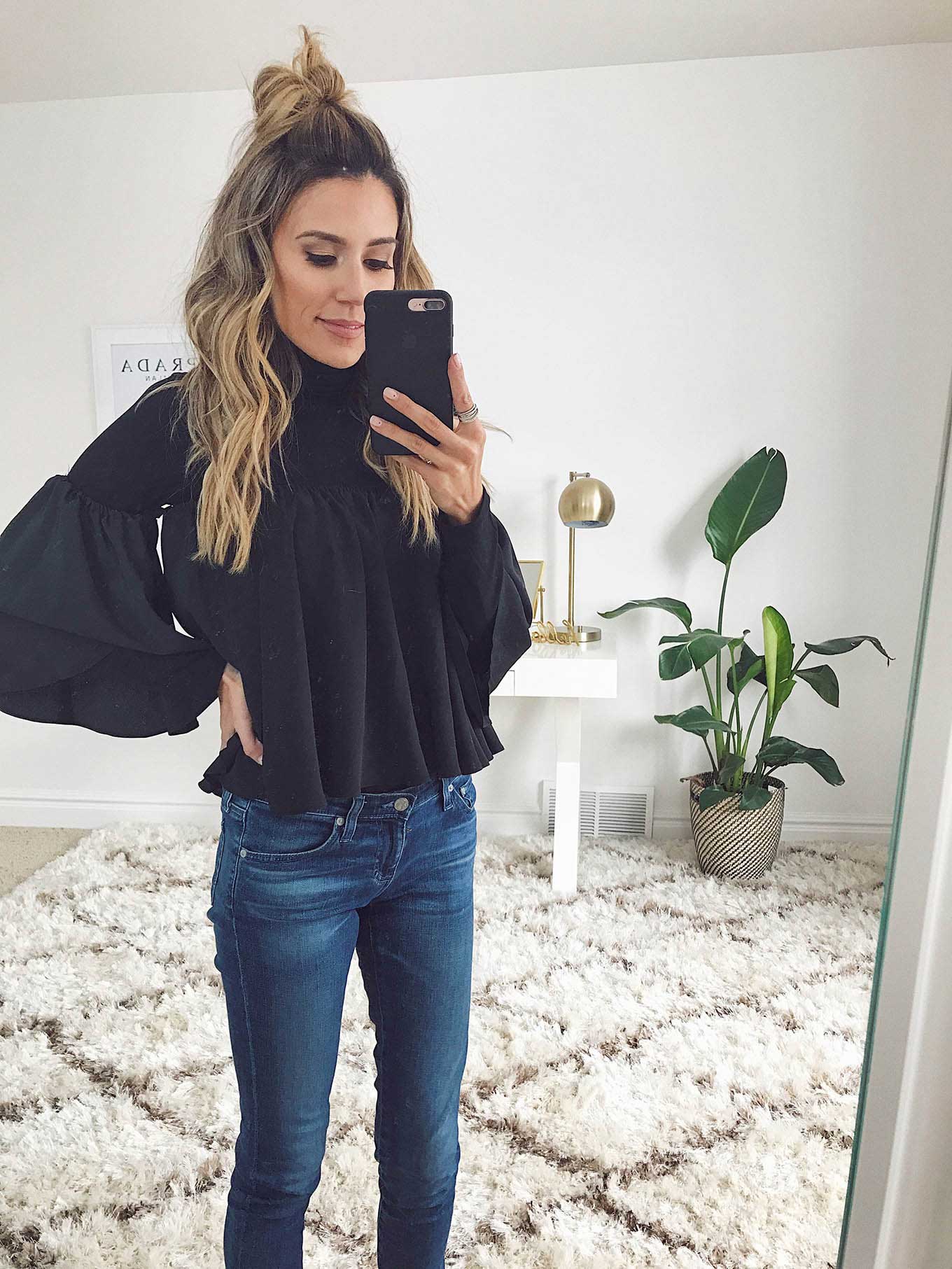 DETAILS: BLACK TURTLENECK | FLOWY OFF THE SHOULDER TOP (OLD FROM ILY – SIMILAR HERE UNDER $30) | DENIM | BLACK EMBELLISHED BOOTS | BLACK BOMBER
