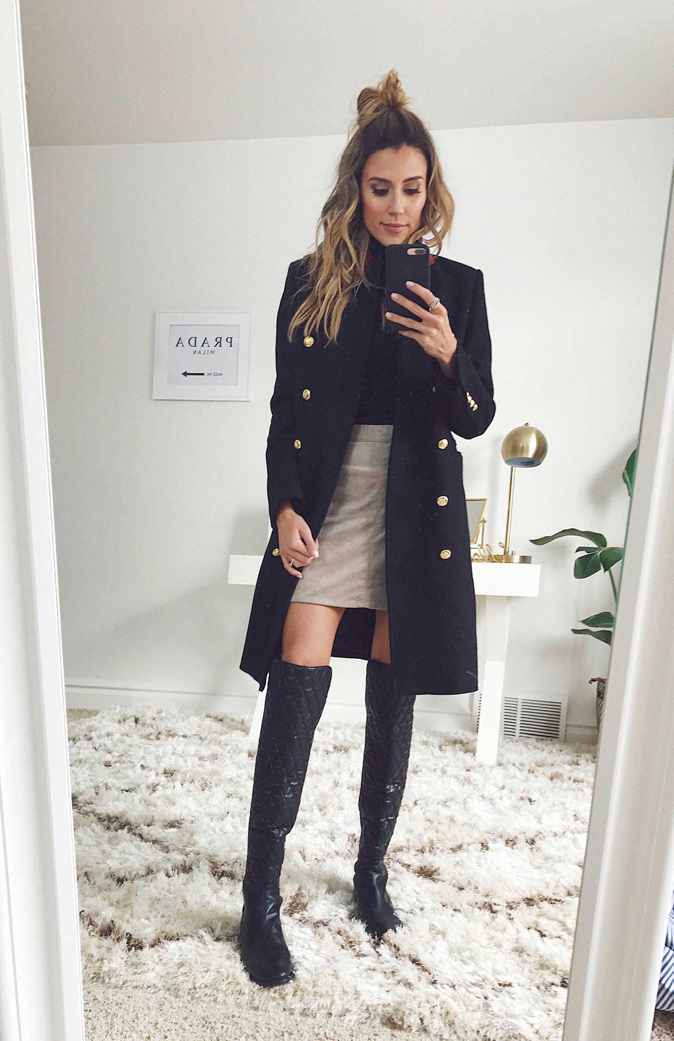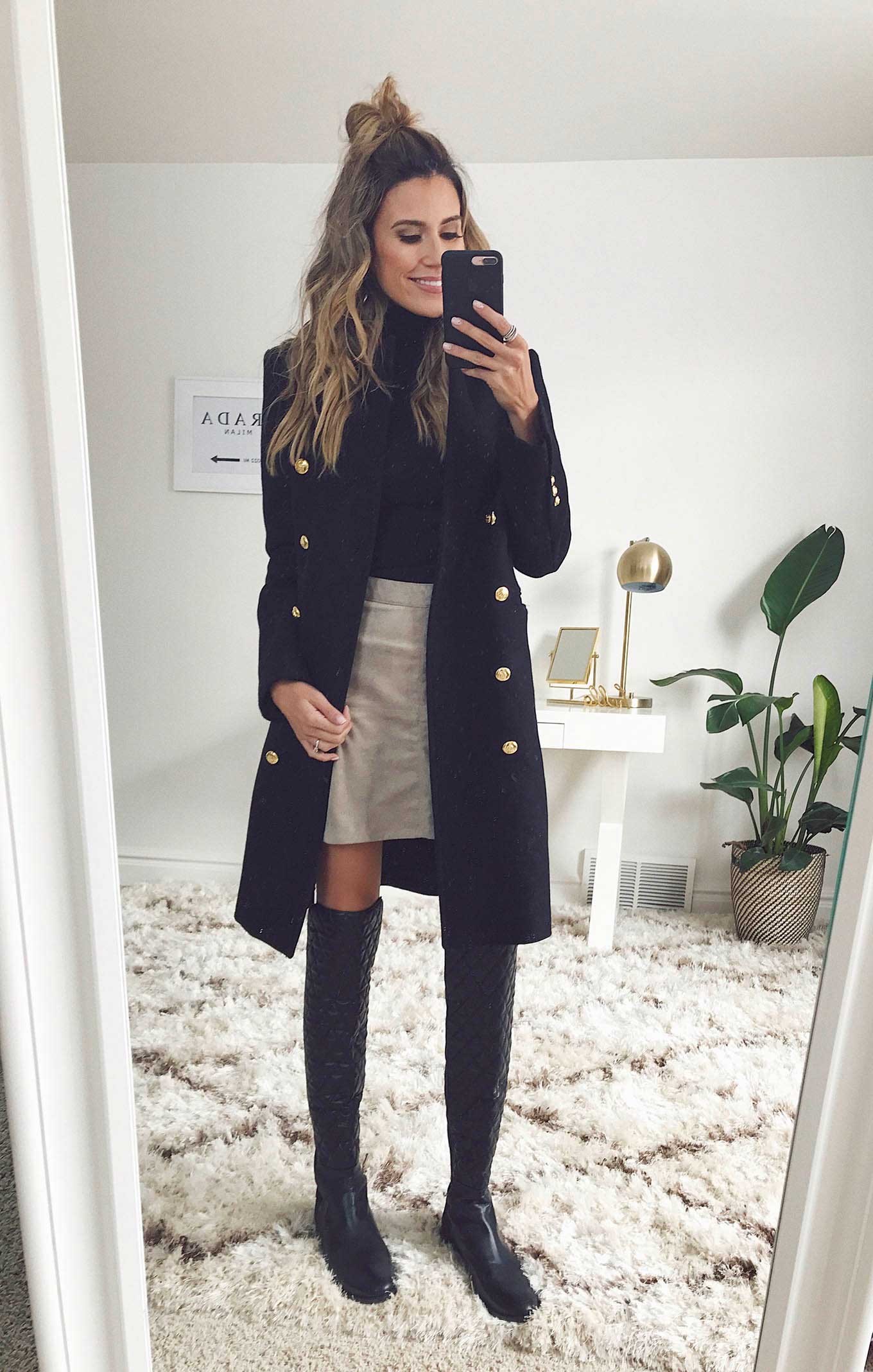 DETAILS: BLACK TURTLENECK | SUEDE MINI SKIRT (UNDER $100 – LOVE THIS ONE) | MILITARY PEA COAT (SIMILAR HERE UNDER $100 – LOVE THIS ONE) | BLACK KNEE BOOT (OLD – SIMILAR HERE – LOVE THIS ONE UNDER $100)