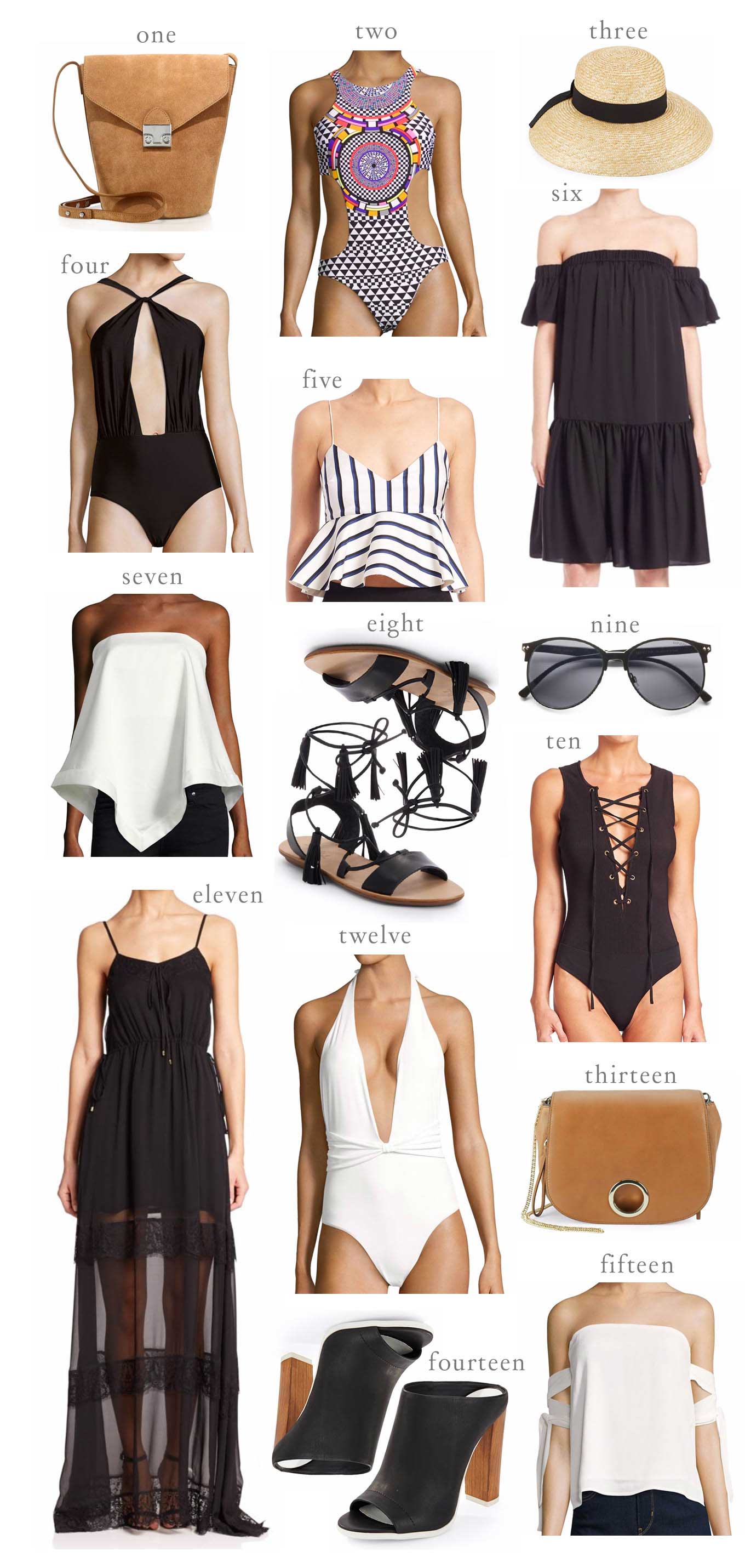 DETAILS: 1. SUEDE BUCKET BAG 2. PRINT HALTER SWIMSUIT (UNDER $100) | 3. STRAW HAT (UNDER $100) | 4. BLACK SWIMSUIT (UNDER $100) | 5. STRIPED PEPLUM TOP | 6. BLACK OFF-THE-SHOULDER DRESS | 7. WHITE BANDANA TOP (UNDER $100) | 8.LACE-UP SANDALS | 9. SUNGLASSES (UNDER $25) | 10. LACE-UP BODYSUIT (UNDER $50) | 11.BLACK MAXI DRESS (UNDER $100) | 12. WHITE SWIMSUIT (UNDER $100) | 13. CROSSBODY BAG | 14. BLACK MULES | 15. WHITE OFF-THE-SHOULDER (UNDER $30)