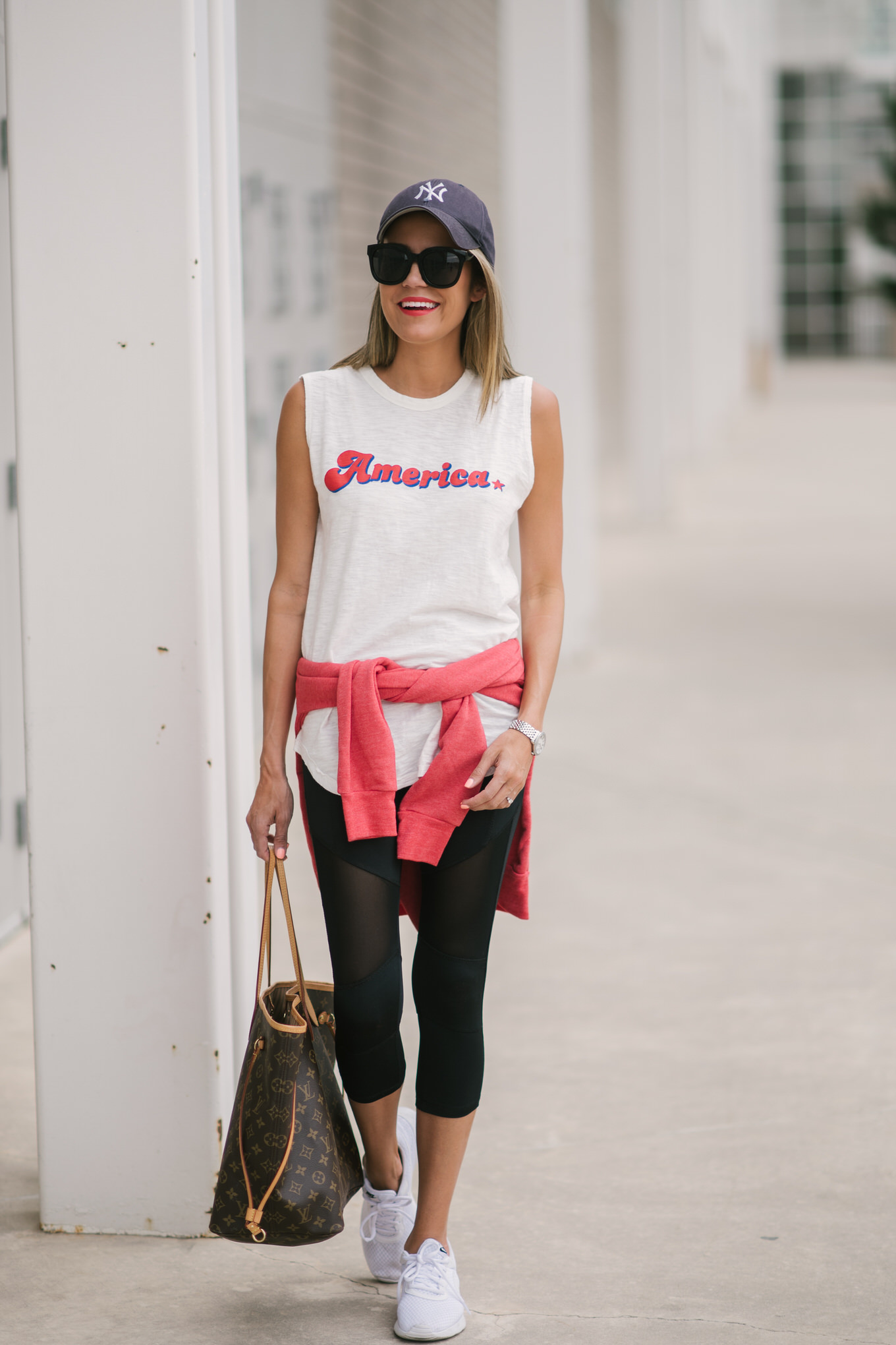 LOOK 2: AMERICA TANK | LEGGINGS | RED ZIP-UP HOODIE | BASEBALL HAT | SUNGLASSES | SILVER WATCH | TOTE | WHITE SNEAKERS