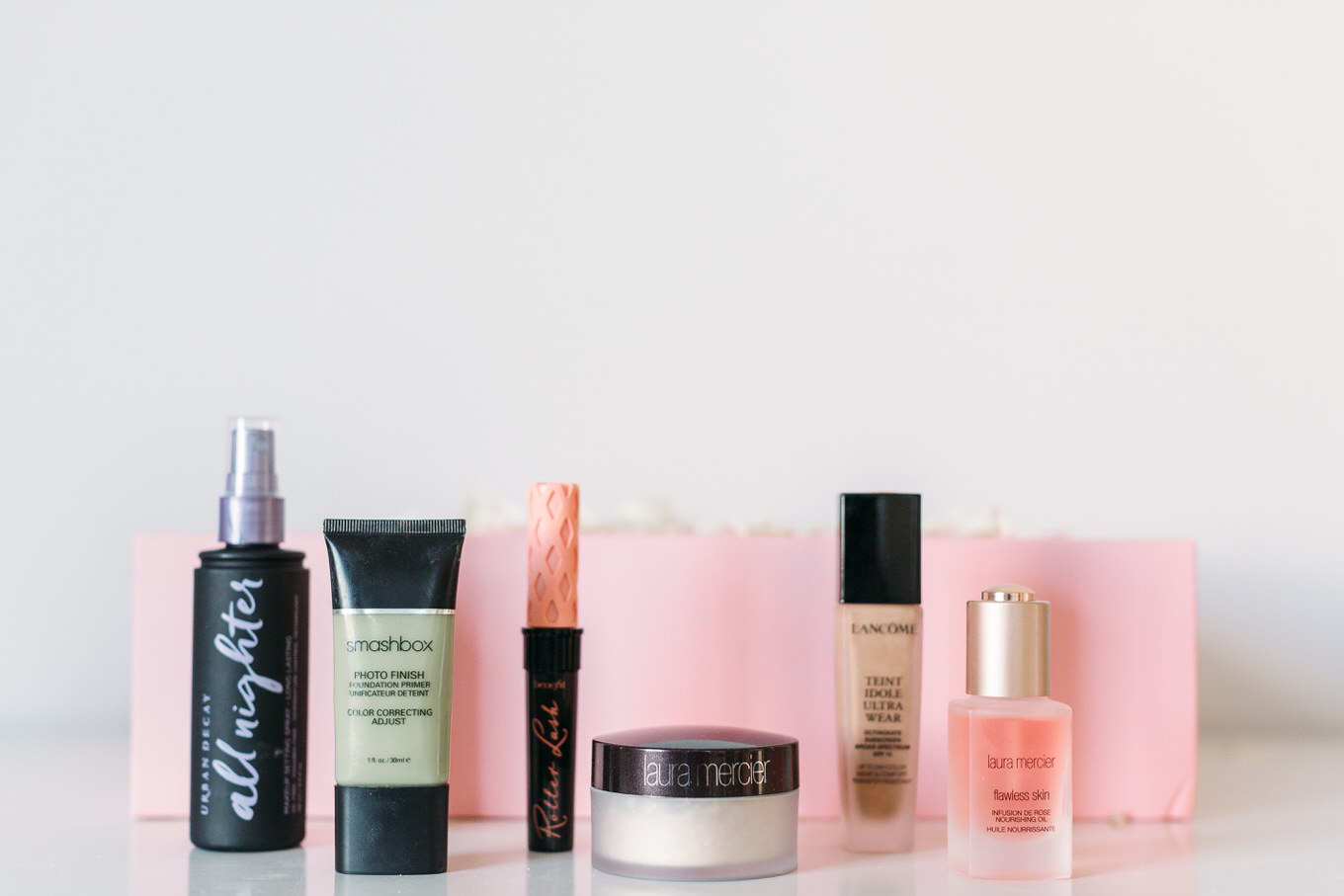 1. Primer: A primer is a no-brainer to get the most wear out or your makeup. It creates a really smooth base for your foundation so it doesn’t come off easily throughout the day.Β I switch back and forth between this Smashbox Photofinish PrimerΒ and the Smashbox Pore Primer. Both are great! Some days I just notice my pores a little more around my nose and want to smooth them out. The primer has such a velvety smooth finish that makes your foundation go on really smooth and last all day.