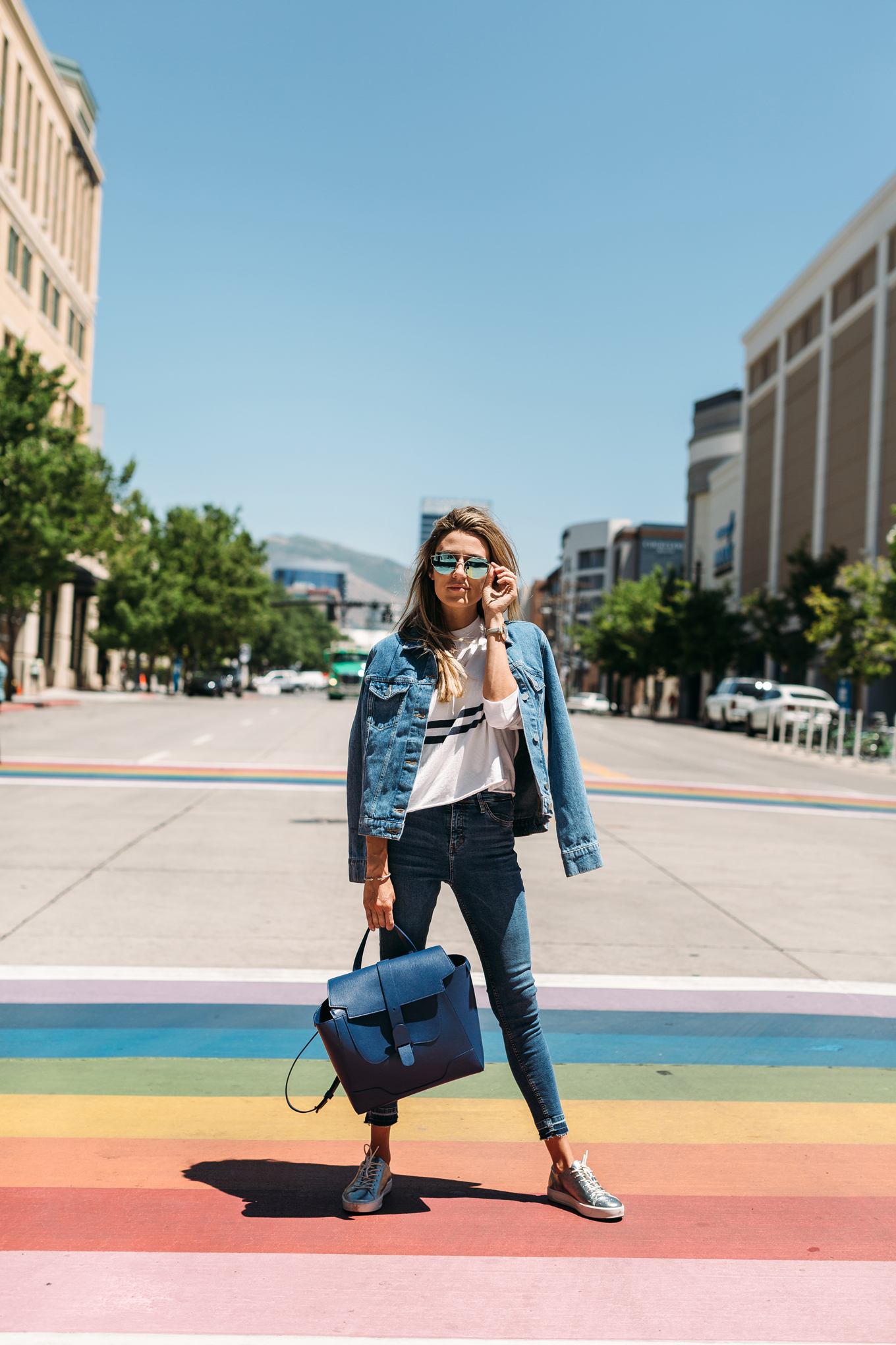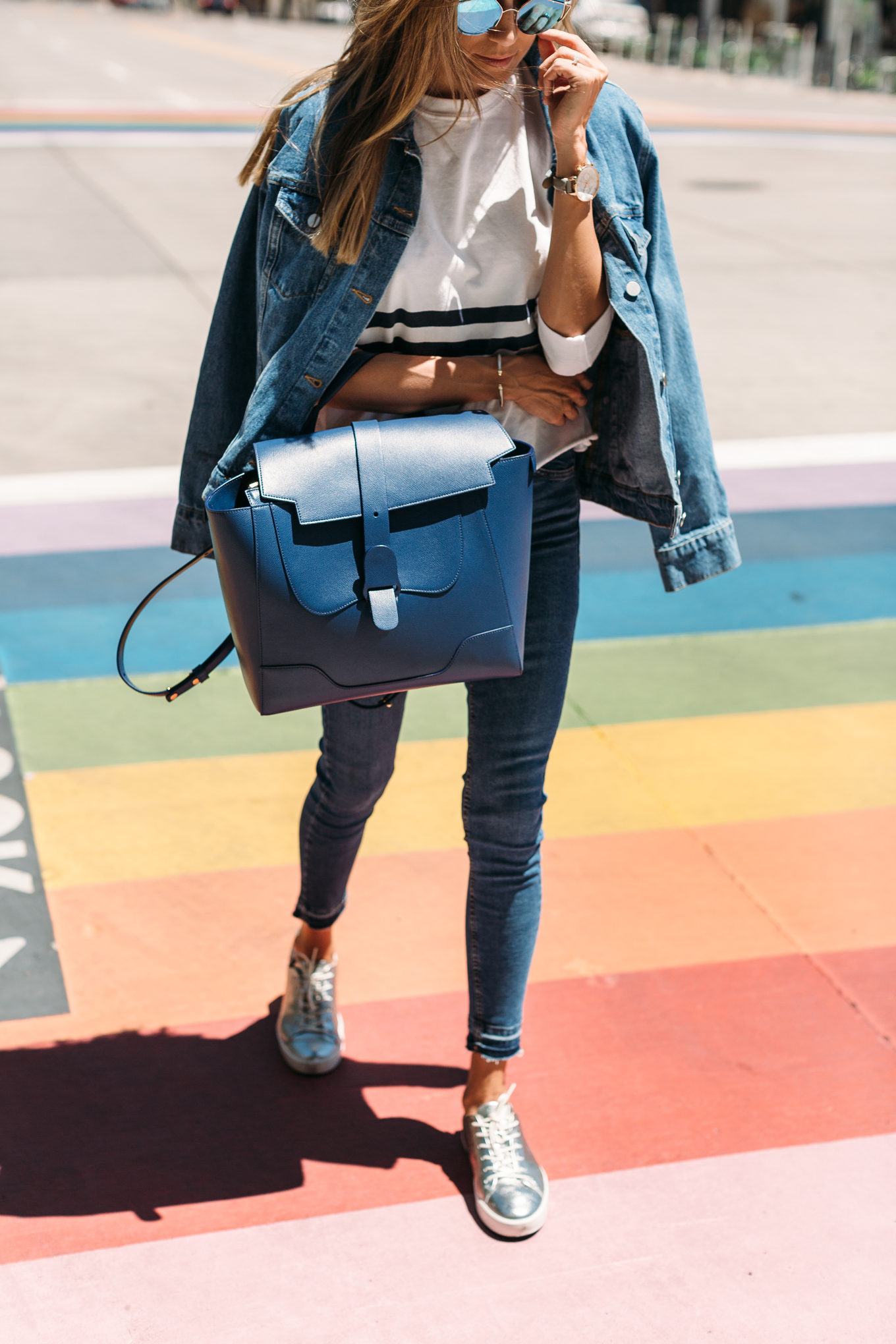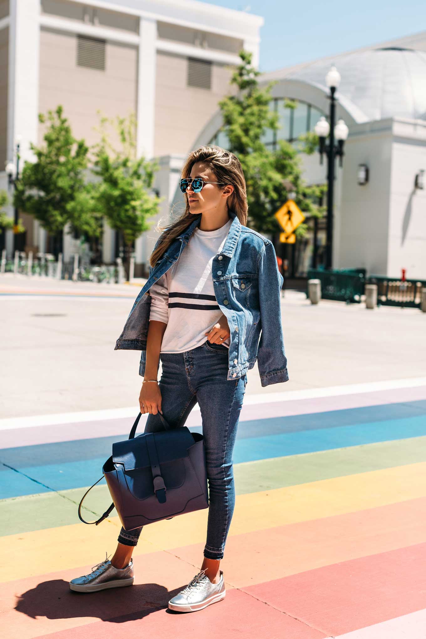 DETAILS: DENIM (UNDER $100) | SILVER SNEAKERS (ON SALE) | NAVY LEATHER BAG |STRIPED TEE | PERSONALIZED DENIM JACKET (WAS A GIFT – SIMILAR HERE) | ILY SUNGLASSES | GREY WATCH