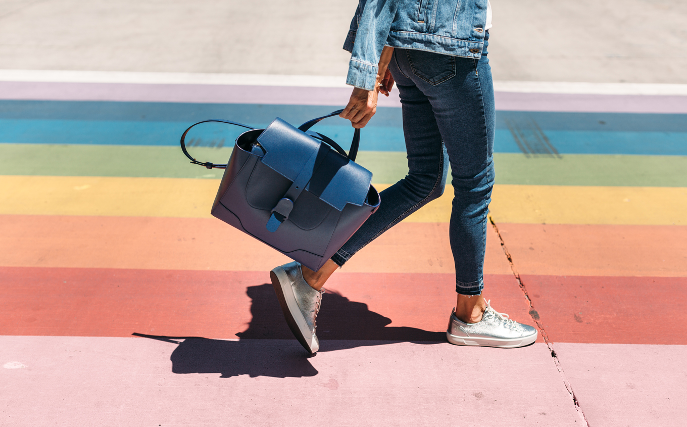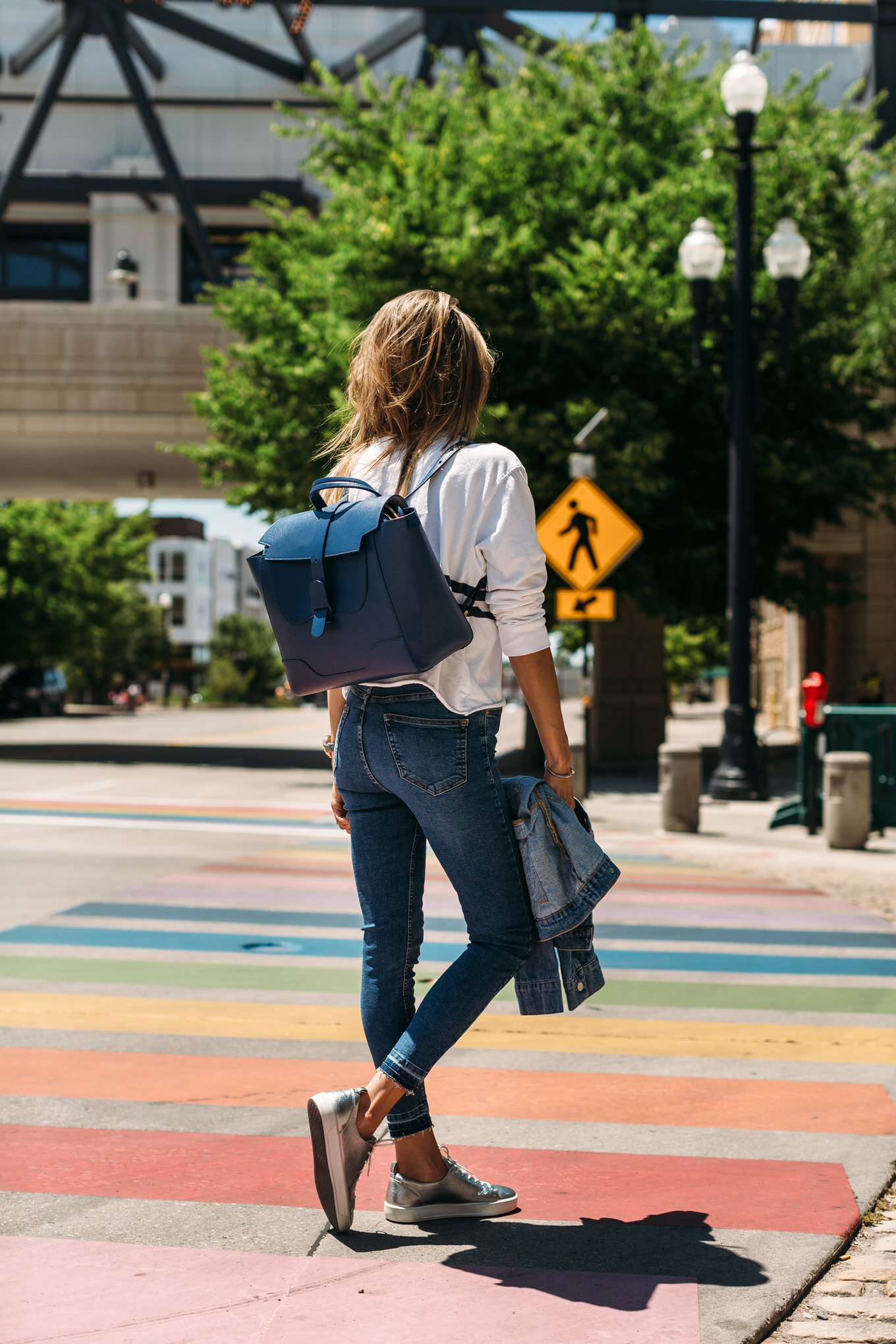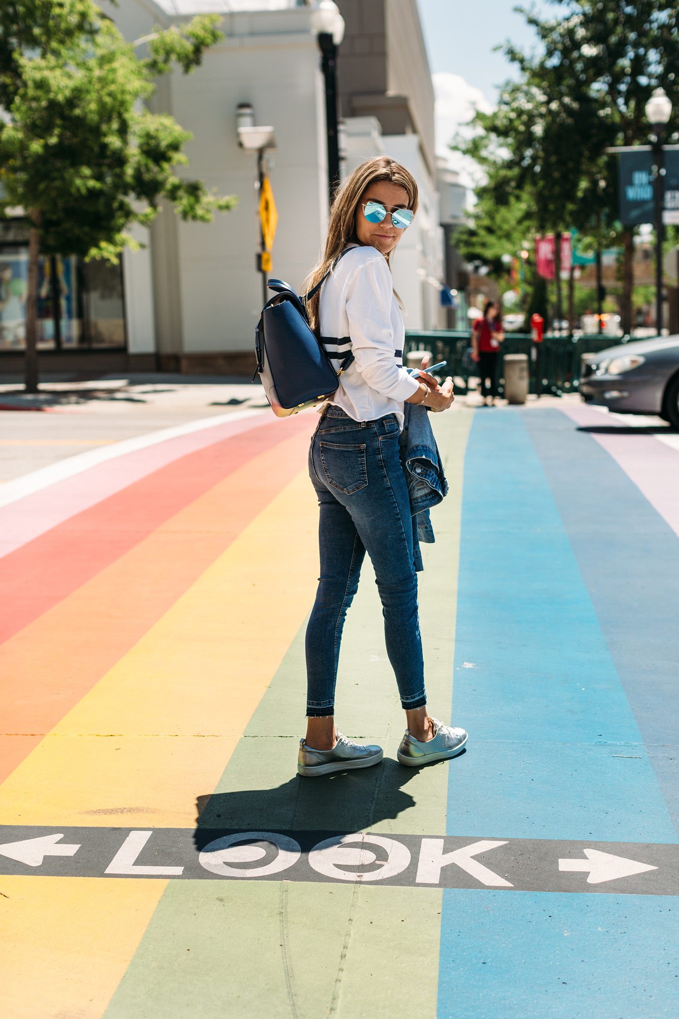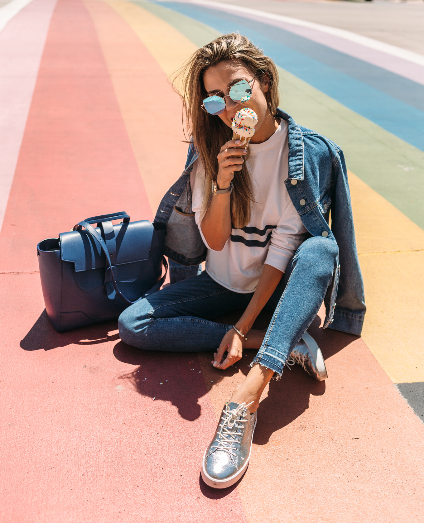 DETAILS: DENIM (UNDER $100) | SILVER SNEAKERS (ON SALE) | NAVY LEATHER BAG |STRIPED TEE | PERSONALIZED DENIM JACKET (WAS A GIFT – SIMILAR HERE) | ILY SUNGLASSES | GREY WATCH