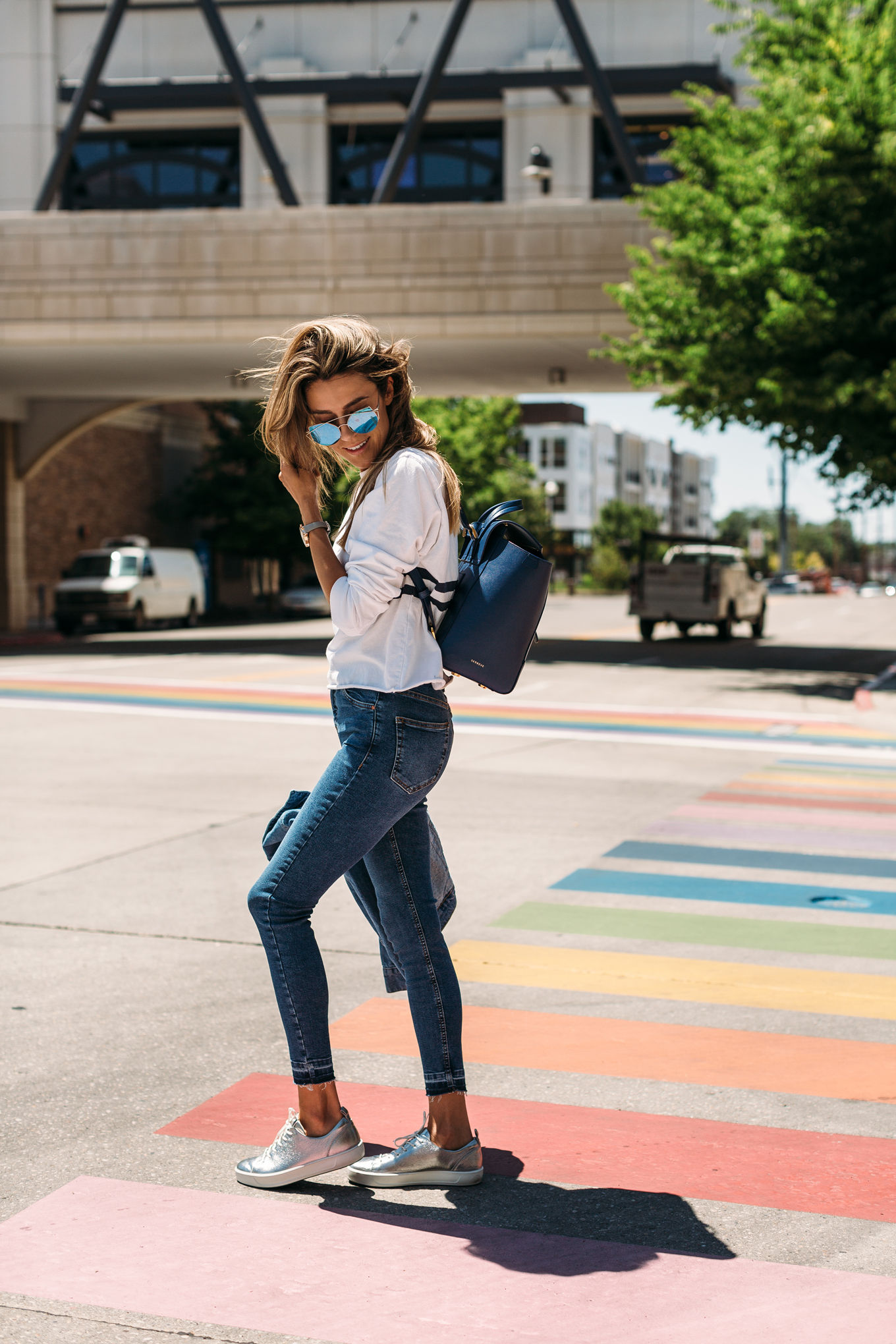 Remember this amazing bag from this post – well it’s been on major repeat! I love how versatile it is and it can transition so easily for any occasion. These metallic sneakers (last seen here) are another piece that I have been wearing a lot! They are seriously so so soft and a great alternative to a classic white sneaker. Lastly these jeans! I am obsessed with the high waist fit and they are really comfortable and flattering. They are also under $100!