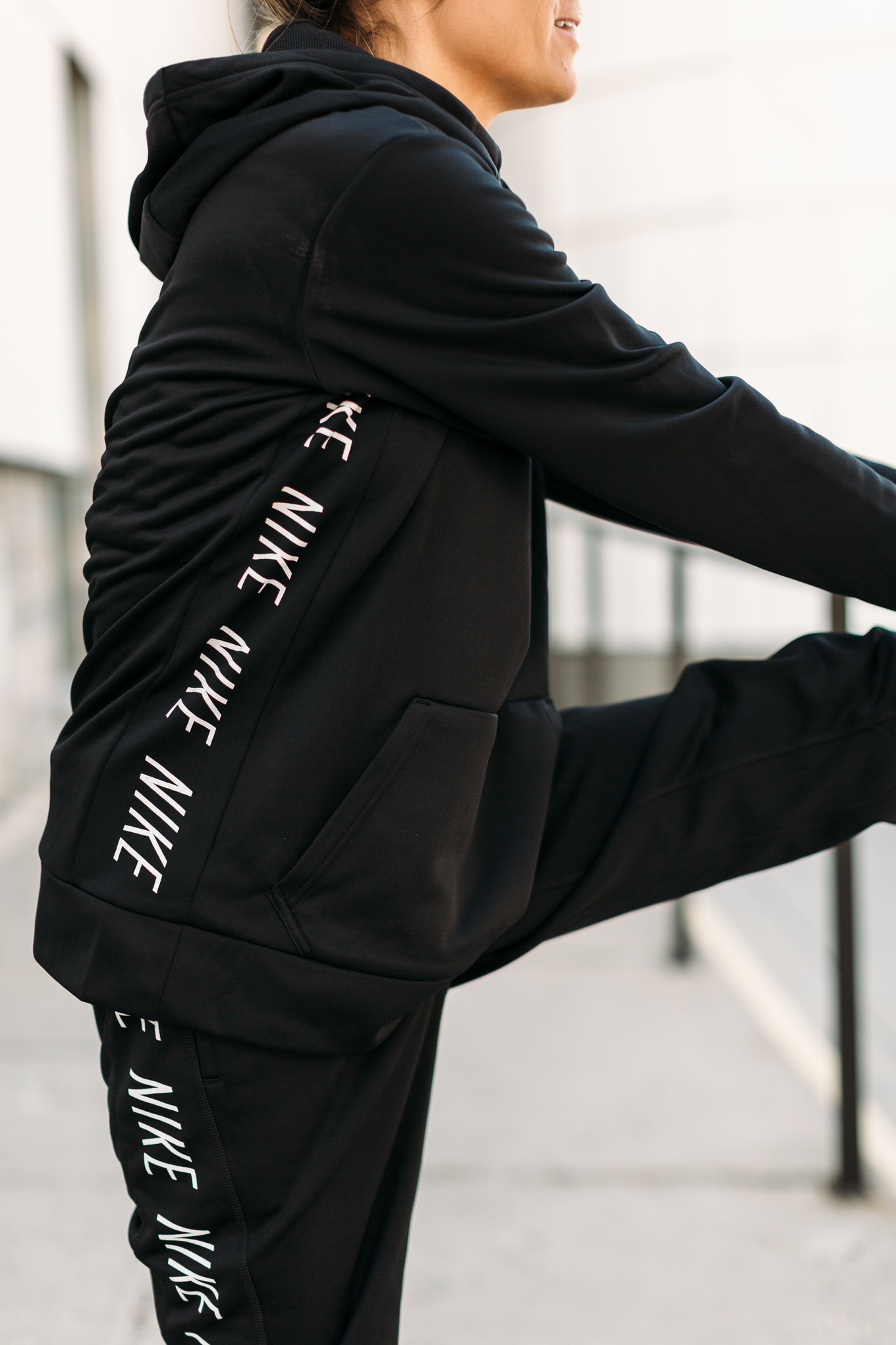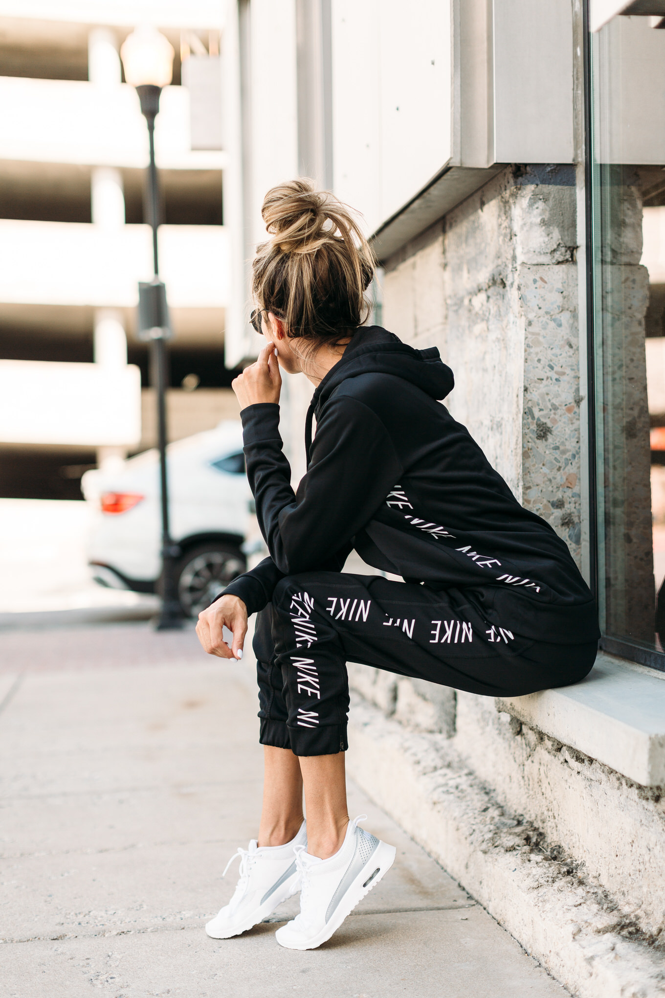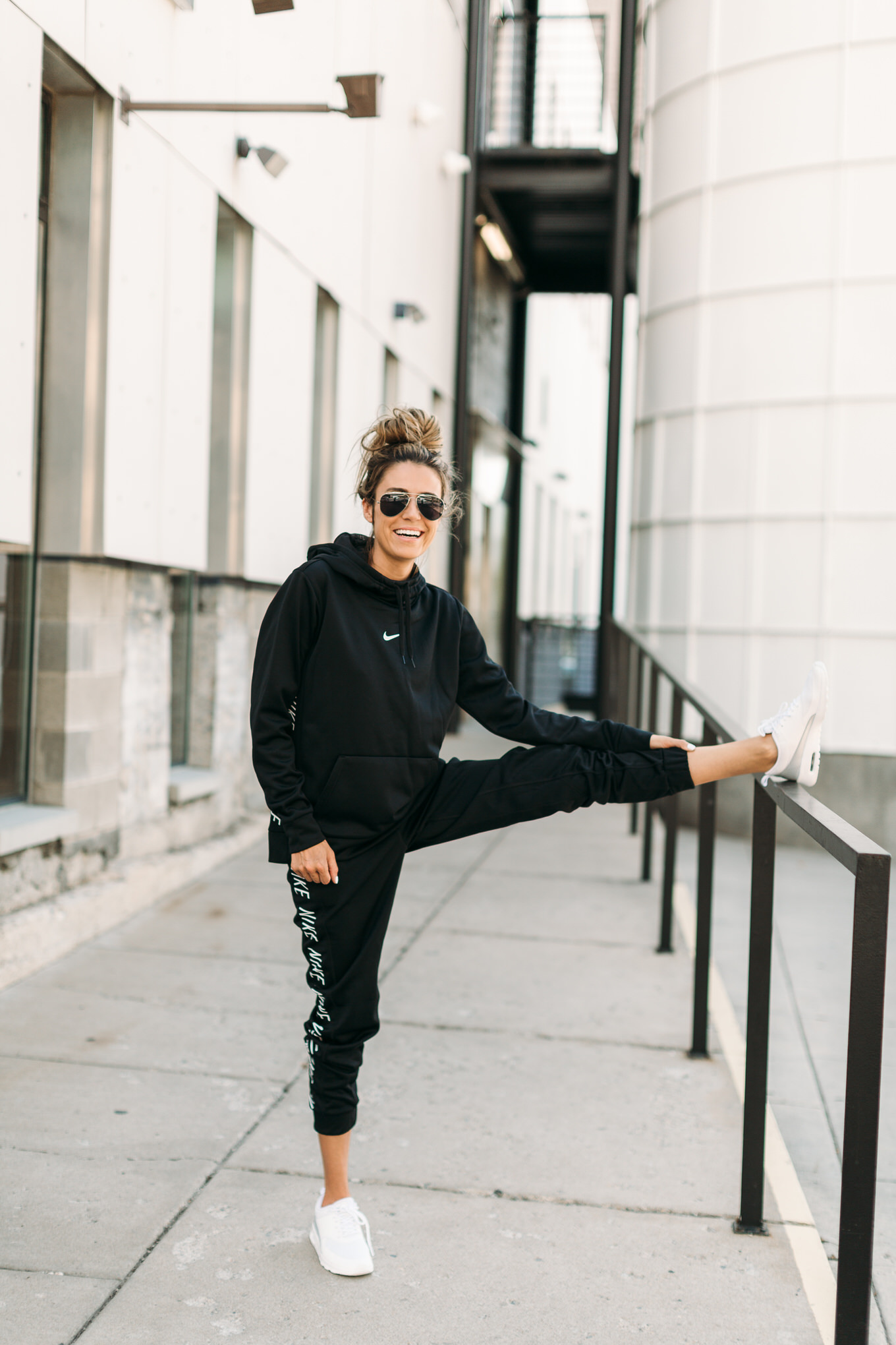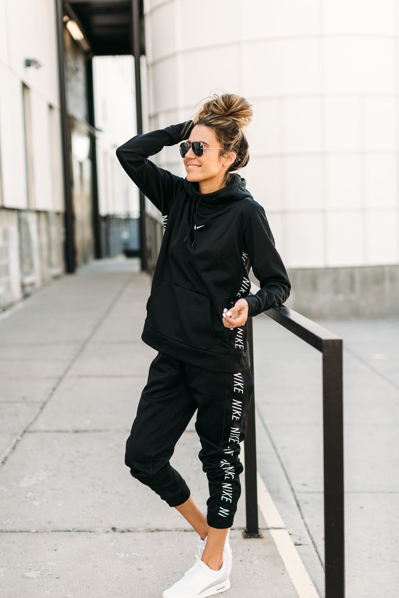 DETAILS: NIKE HOODIE (WEARING SIZE MEDIUM – I ALWAYS SIZE UP ON SWEATSHIRTS) | BLACK NIKE JOGGERS (LOVE THESE – ON SALE UNDER $50 – WEARING SIZE SMALL) | WHITE SNEAKERS (SIMILAR HERE)