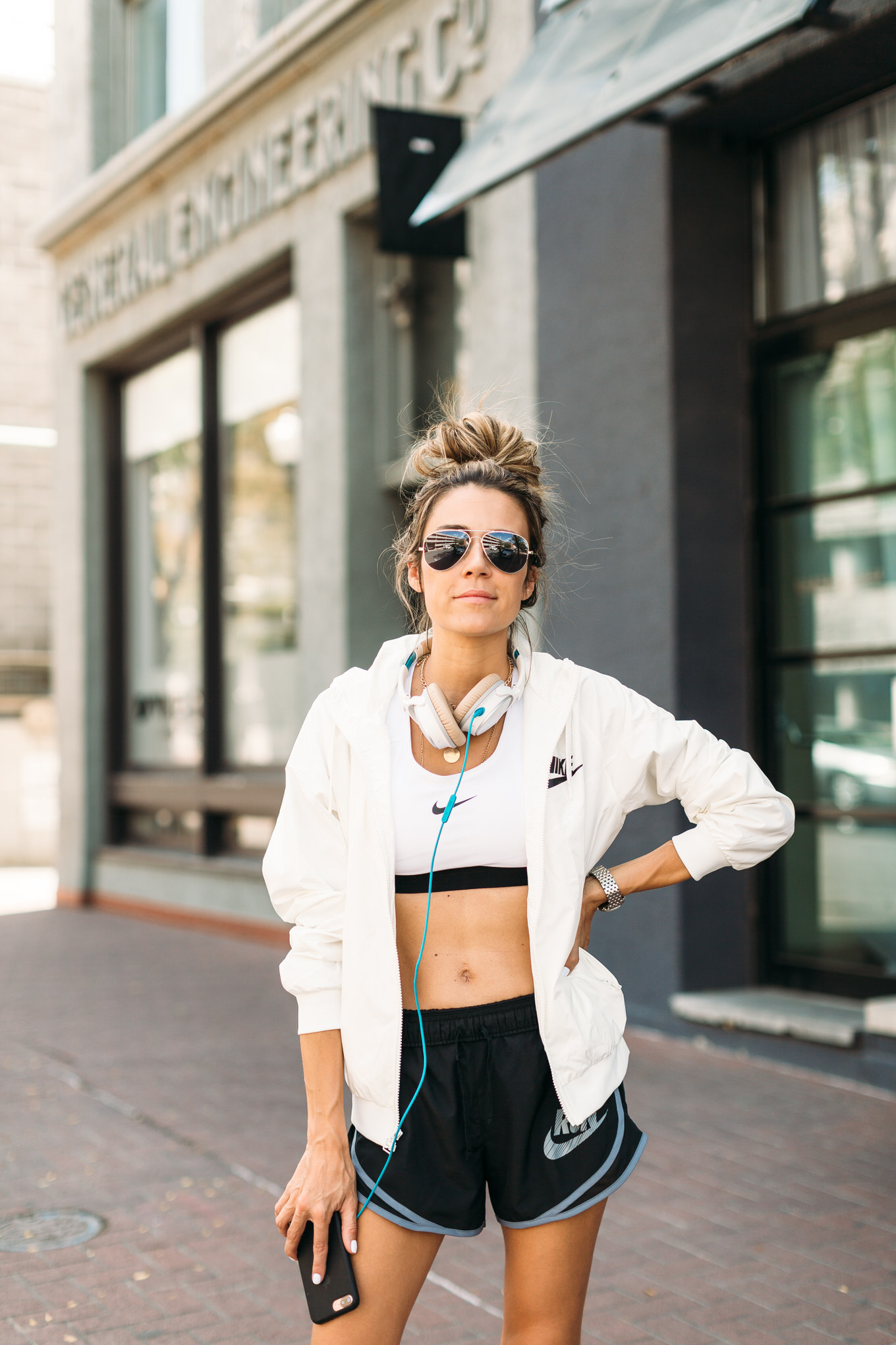 DETAILS: WHITE WINDBREAKER (WEARING SIZE MEDIUM) | WHITE NIKE SPORTS BRA (WEARING SIZE MEDIUM) | BLACK SHORTS (ON SALE – 25% OFF – WEARING SIZE SMALL) | HEADPHONES (SIMILAR HERE ON SALE) | BLACK NIKE SNEAKERS
