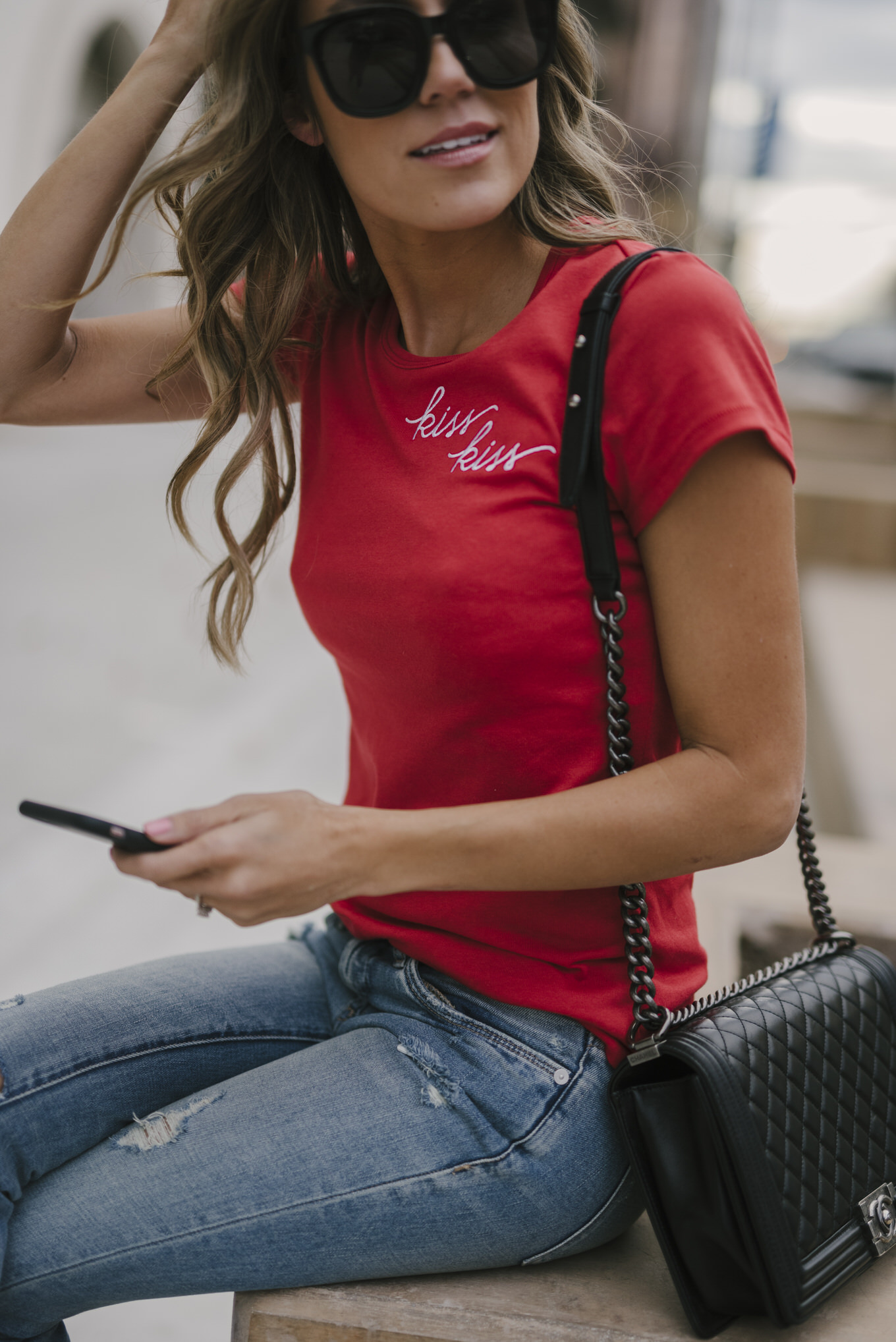 LOOK 4: KISS KISS TEE | FRAYED DENIM | RED BOW SLIDES | SUNGLASSES