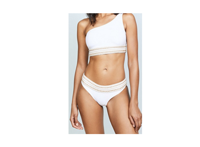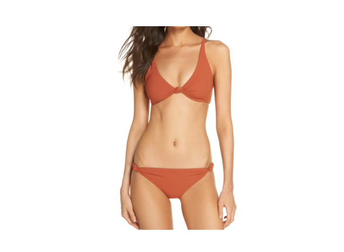 The simple bikini silhouettes that were so big in the 80s and 90s are back in full force, but as fresh as ever with modern details. Can’t get over the knotted detail on this bikini!