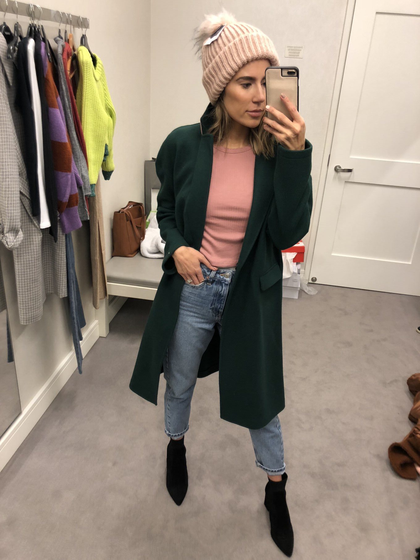 Another coat I want in every color! I love the deep green color paired with the pop of pink.