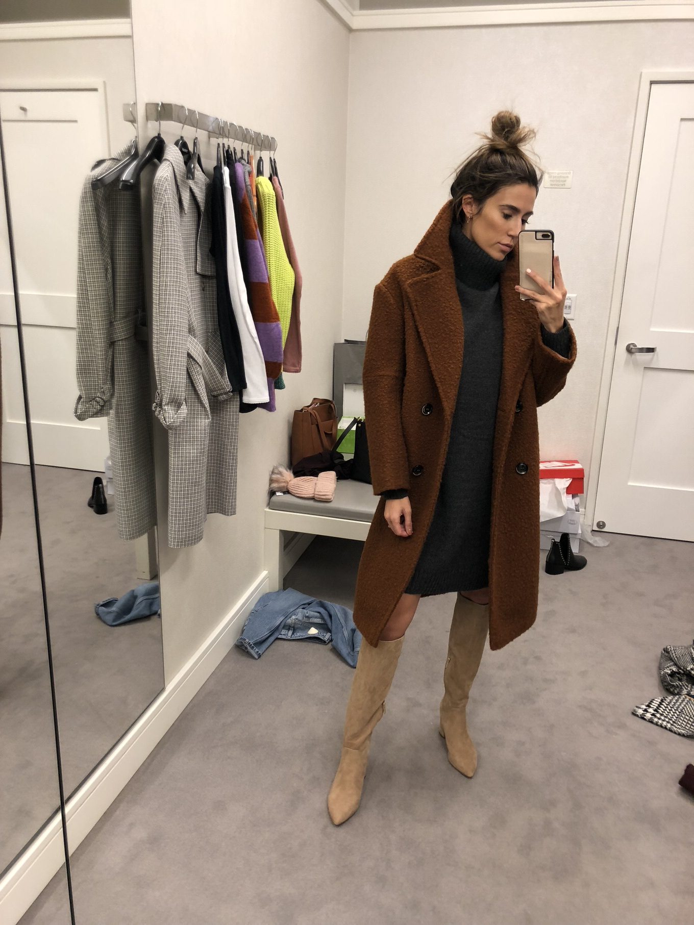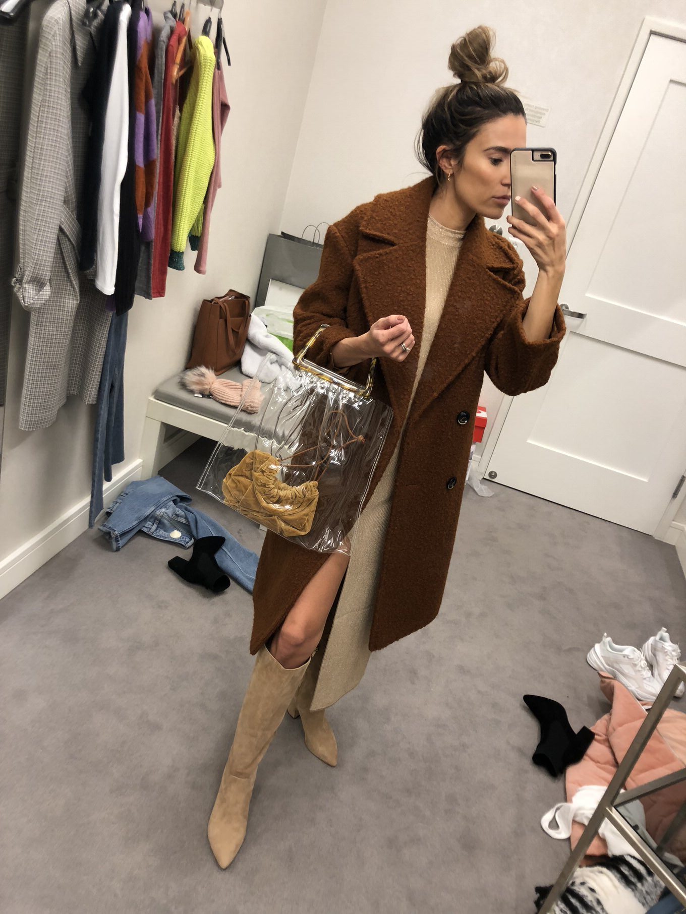 This coat is already on repeat – here again with a cute longer dress and tall boots. And I am loving this clear bag for such a good price! ($40!)