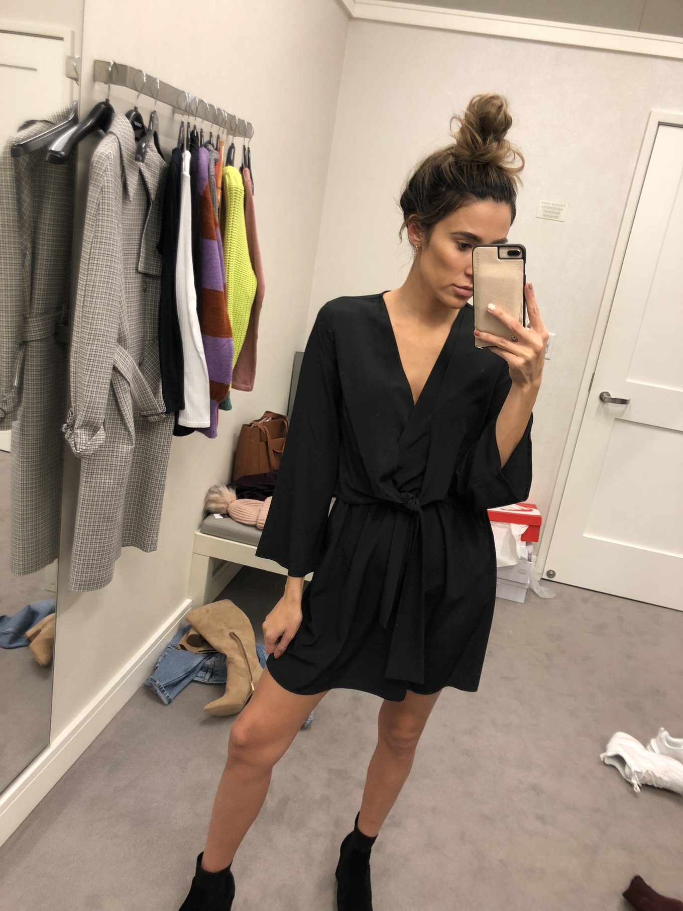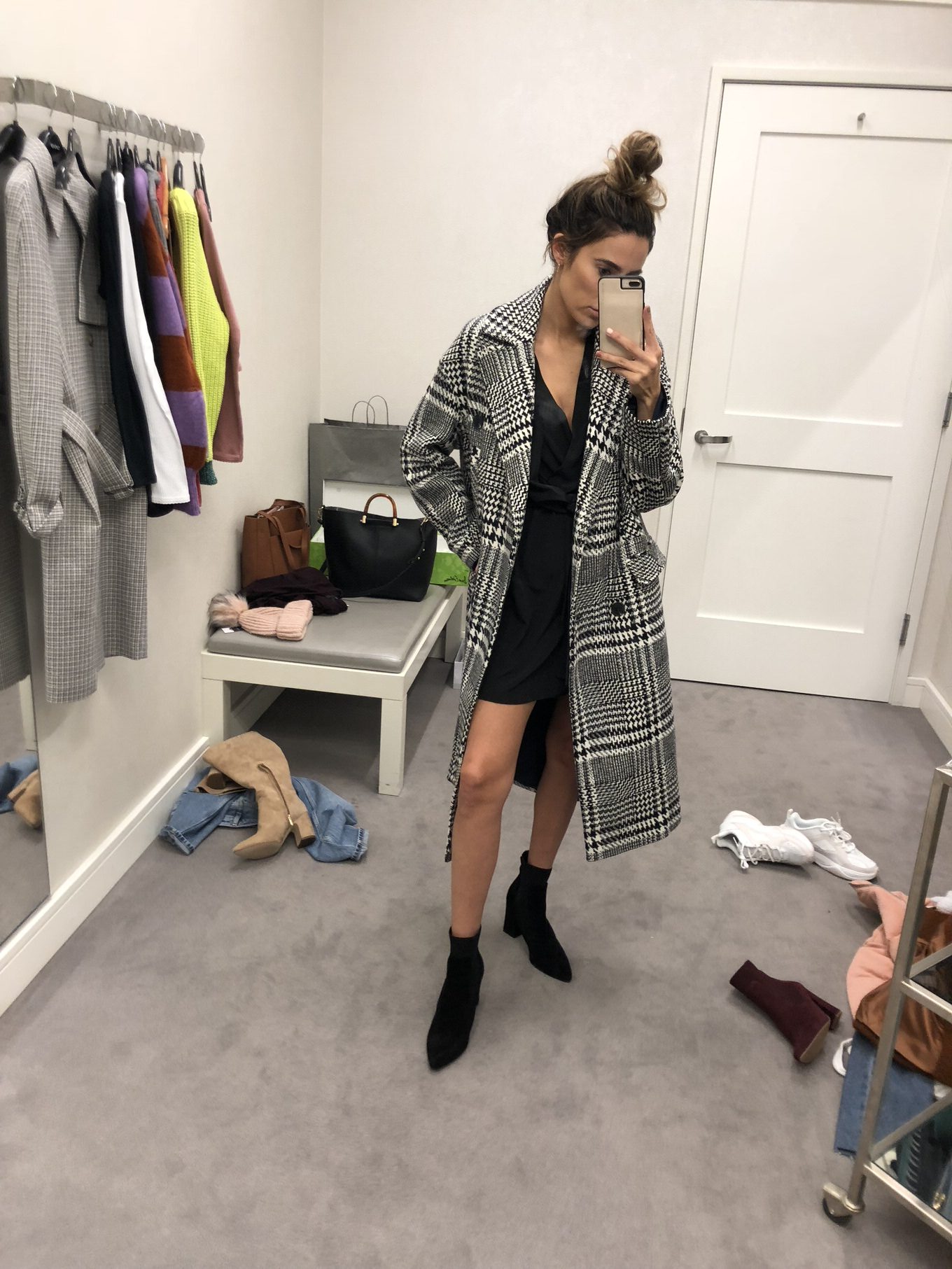 Obsessed with this black dress! Paired with the plaid coat and booties this would be a perfect date night outfit.