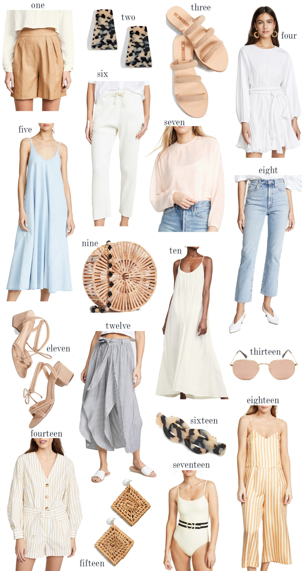 ​1.TAN LINEN SHORTS | 2. TORTOISE EARRINGS | 3. NUDE SANDALS (UNDER $100) | 4. WHITE RUFFLED DRESS | 5. CHAMBRAY DRESS | 6. WHITE RIBBED JOGGERS | 7. BLUSH BODYSUIT | 8. HIGH-WAISTED DENIM | 9. WOODEN SHOULDER BAG | 10. CREAM SWIMSUIT COVER UP | 11. LACE-UP SANDALS | 12. STRIPED SPLIT PANTS (UNDER $100 – | 13. ROSE SUNGLASSES | 14. STRIPED ROMPER | 15. RATTAN EARRINGS (UNDER $50)| 16. TORTOISE BARRETTE | 17. CREAM BELTED SWIMSUIT | 18. STRIPED SILK JUMPSUIT