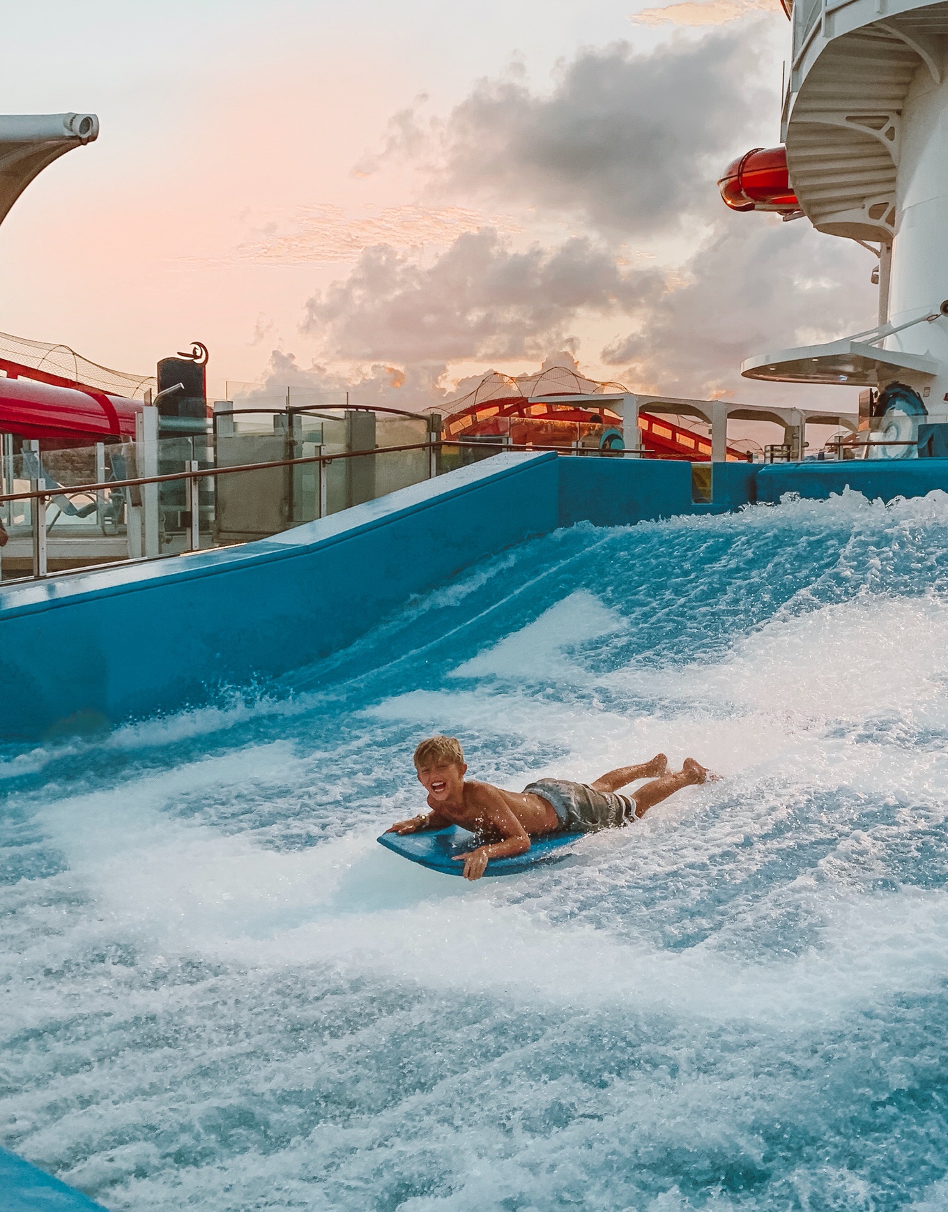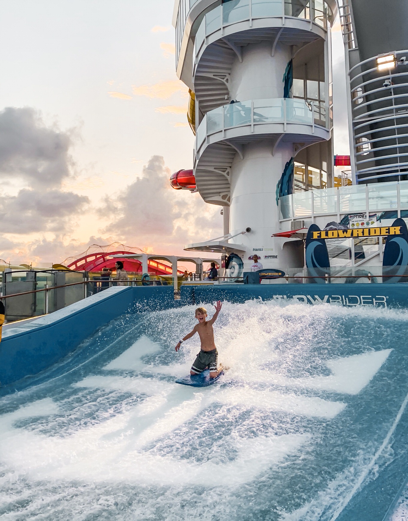 Whoever said it’s all about the journey and not the destination was probably thinking of cruises haha (although the destination was pretty hard to beat!). We were on Navigator of the Seas which has so much to do on board that it was impossible to do everything. It has one of the longest waterslides at sea, The Blaster, and also The Riptide waterslide – which actually twists and turns over the water – the coolest view and feeling like you are floating in air! Wes also rode the FlowRider surf simulator for the first time. Wes got up so easy; that kid is so naturally athletic. It’s so cool to experience so many firsts with the kids… One of my favorite parts of traveling!