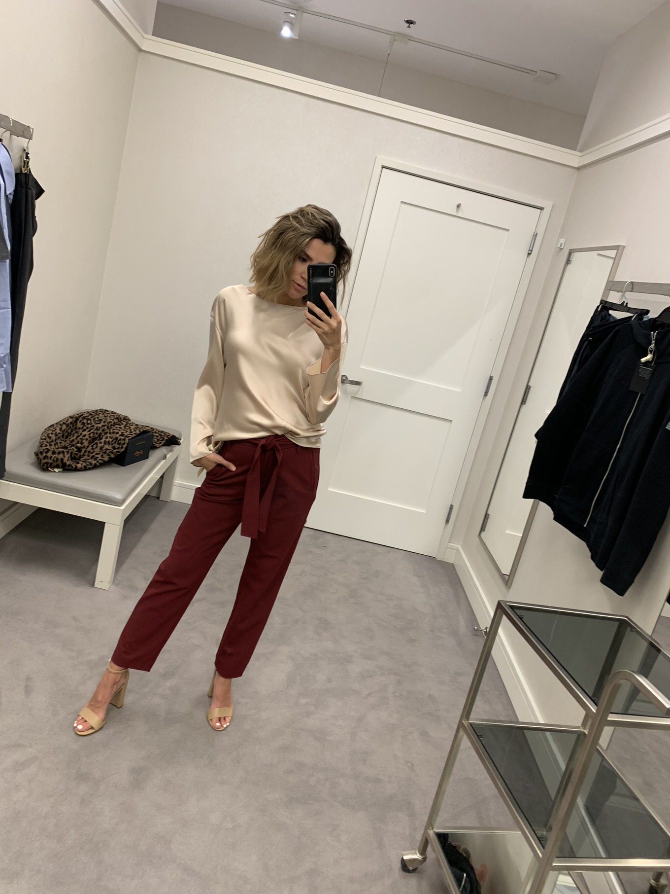 DETAILS: NUDE SILK TOP | BURGUNDY TROUSERS (ON SALE UNDER $100 – WEARING SIZE 4) | LEOPARD OVERCOAT (ON SALE 35% OFF – WEARING SIZE S) | NUDE SANDALS (UNDER$100)