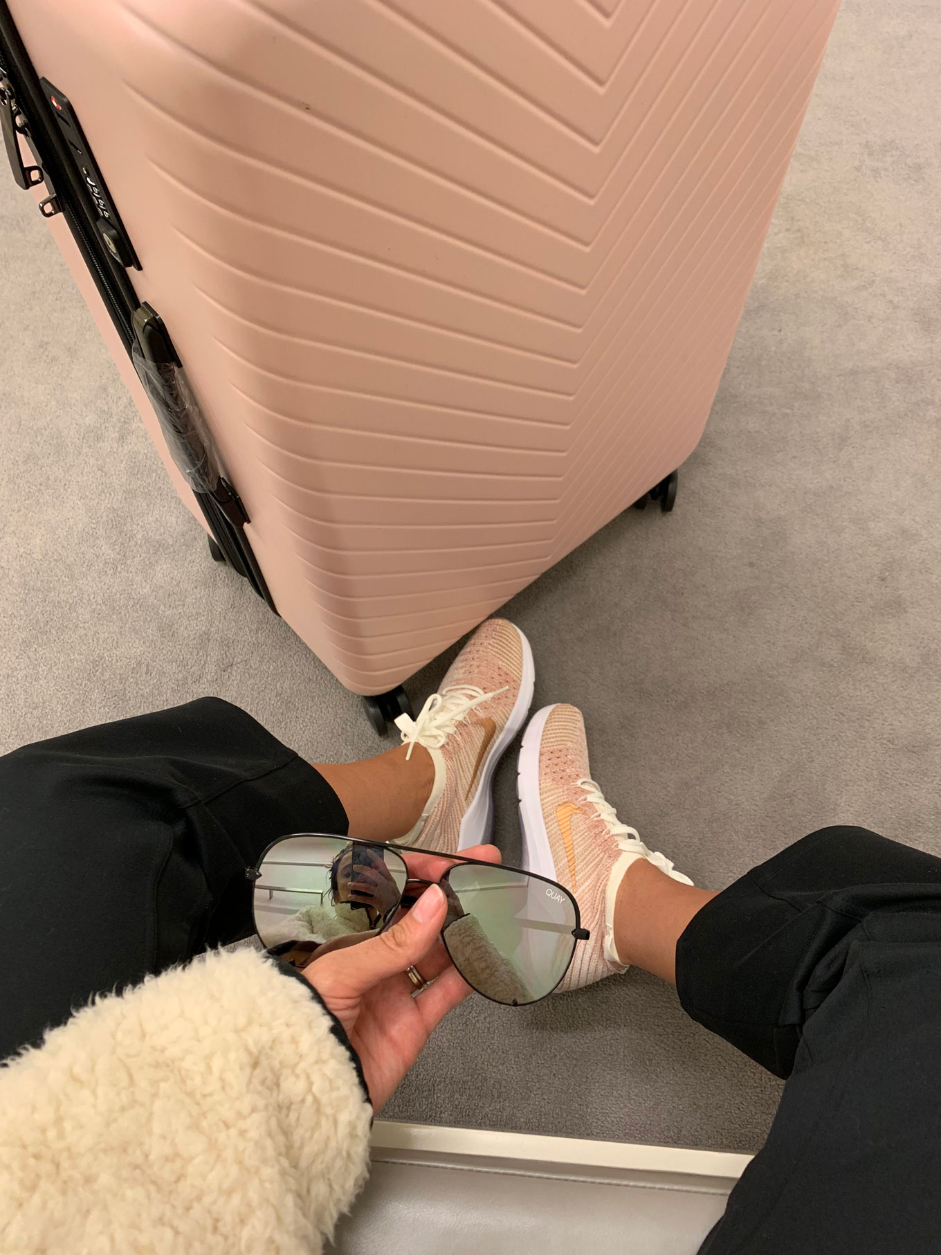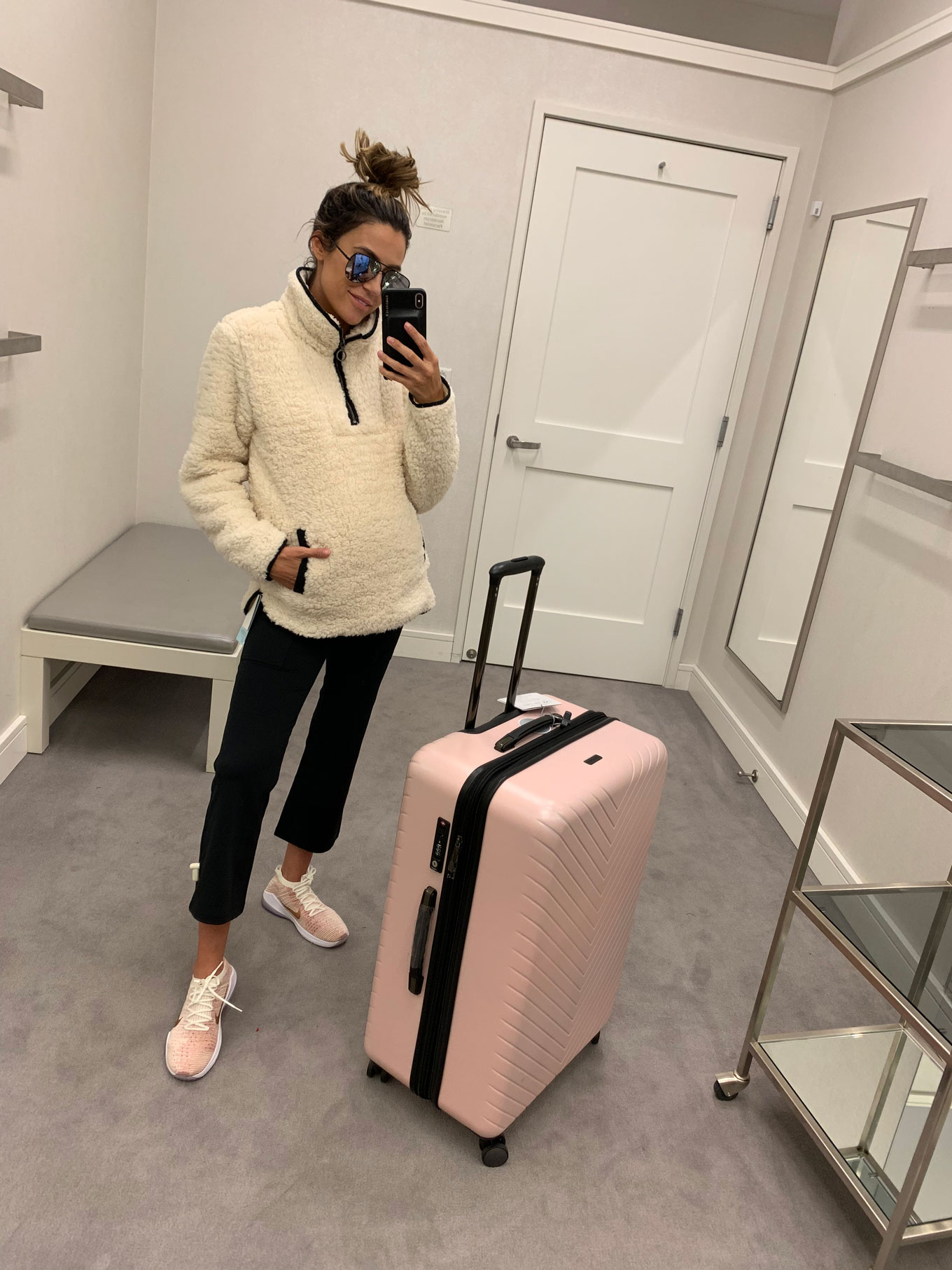 DETAILS: PINK TANK (ON SALE UNDER $50) | WHITE SHERPA PULLOVER (ON SALE UNDER $50 – WEARING SIZE M) | BLACK CROPPED LEGGINGS (ON SALE UNDER $50) | PINK SNEAKERS (ON SALE UNDER $100) | SUNGLASSES (ON SALE UNDER $100) | PINK LUGGAGE