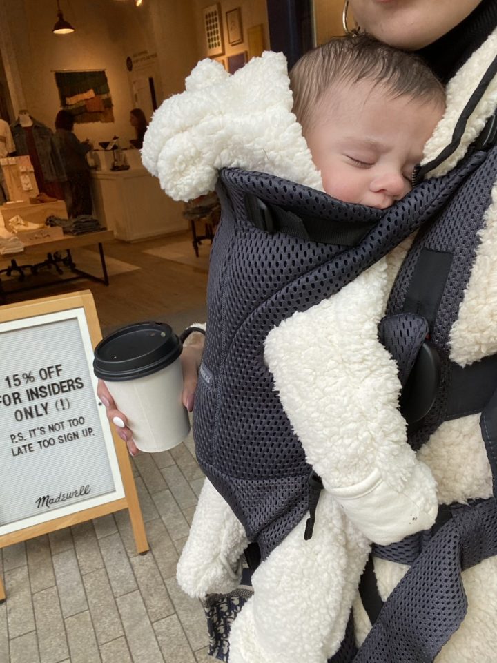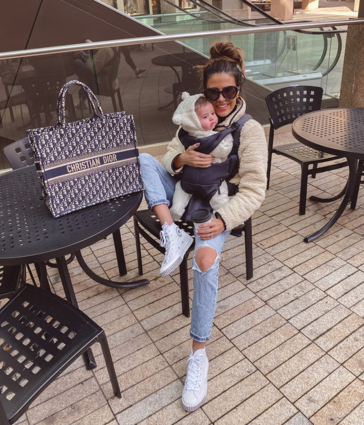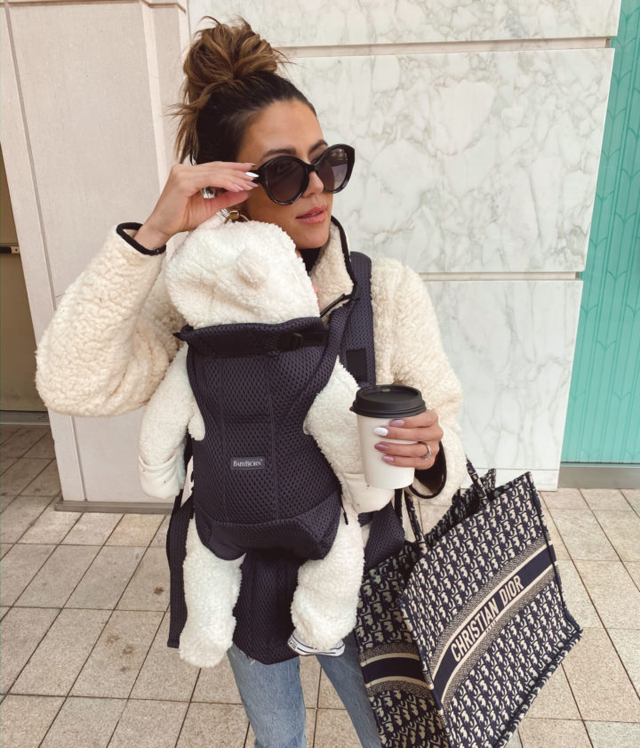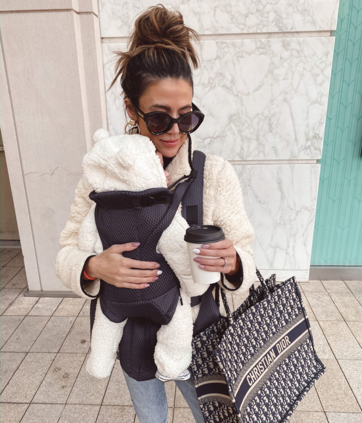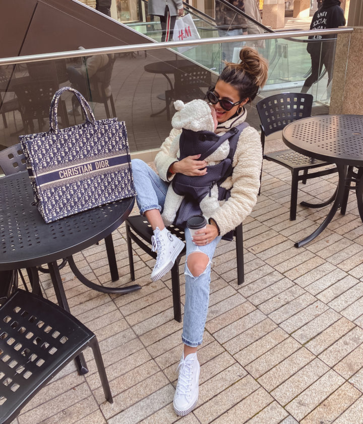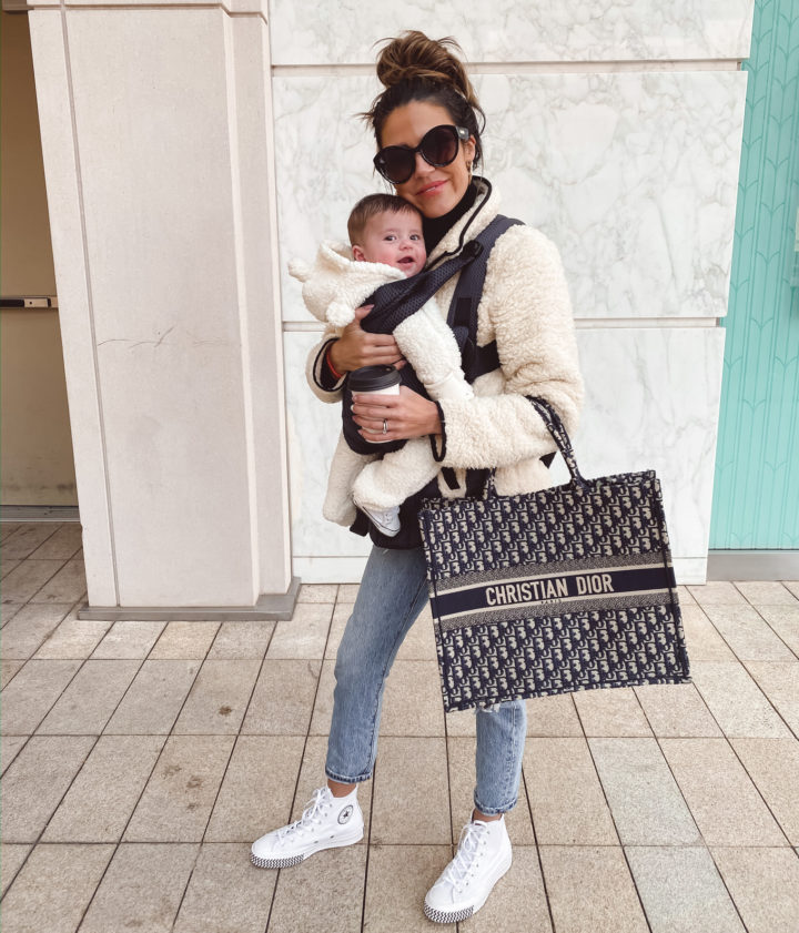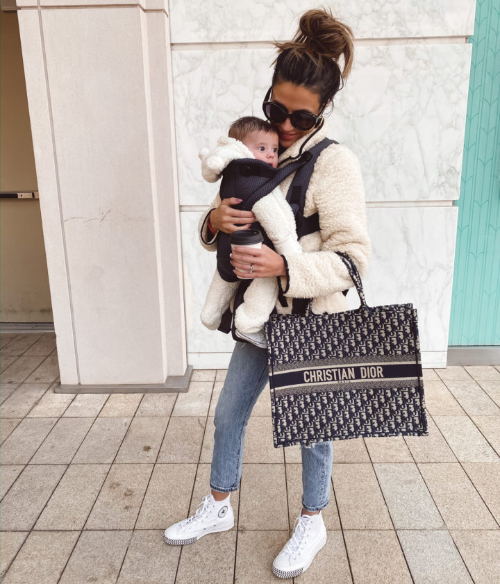 DETAILS: SHERPA PULLOVER | DENIM | CONVERSE | SUNGLASSES | OLLIE’S SHERPA SUIT | BABYBJORN BABY FREE CARRIER | LIPSTICK