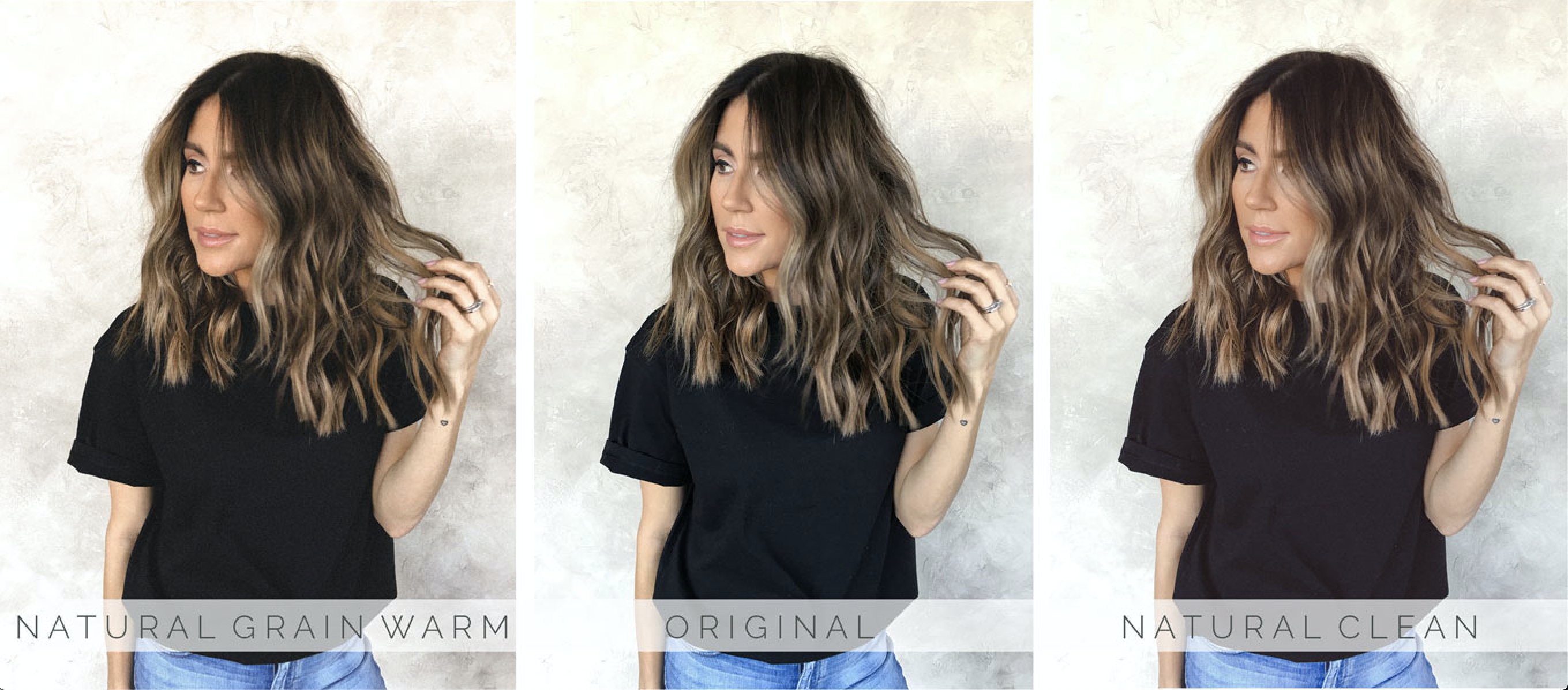 Here is the Natural Warm preset with my everyday preset (original in the middle) so you can see how the edit hits on the same picture. All of them are so good and will help unify your feed – but keep them pretty true to color.
