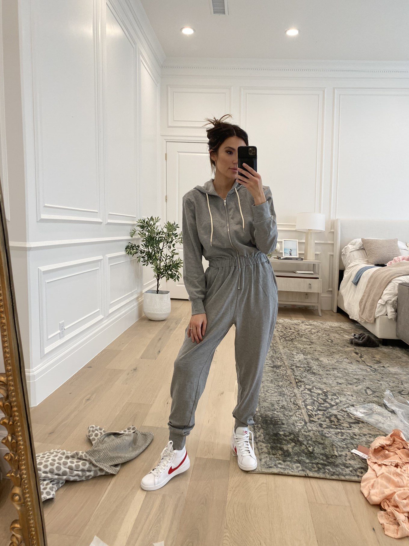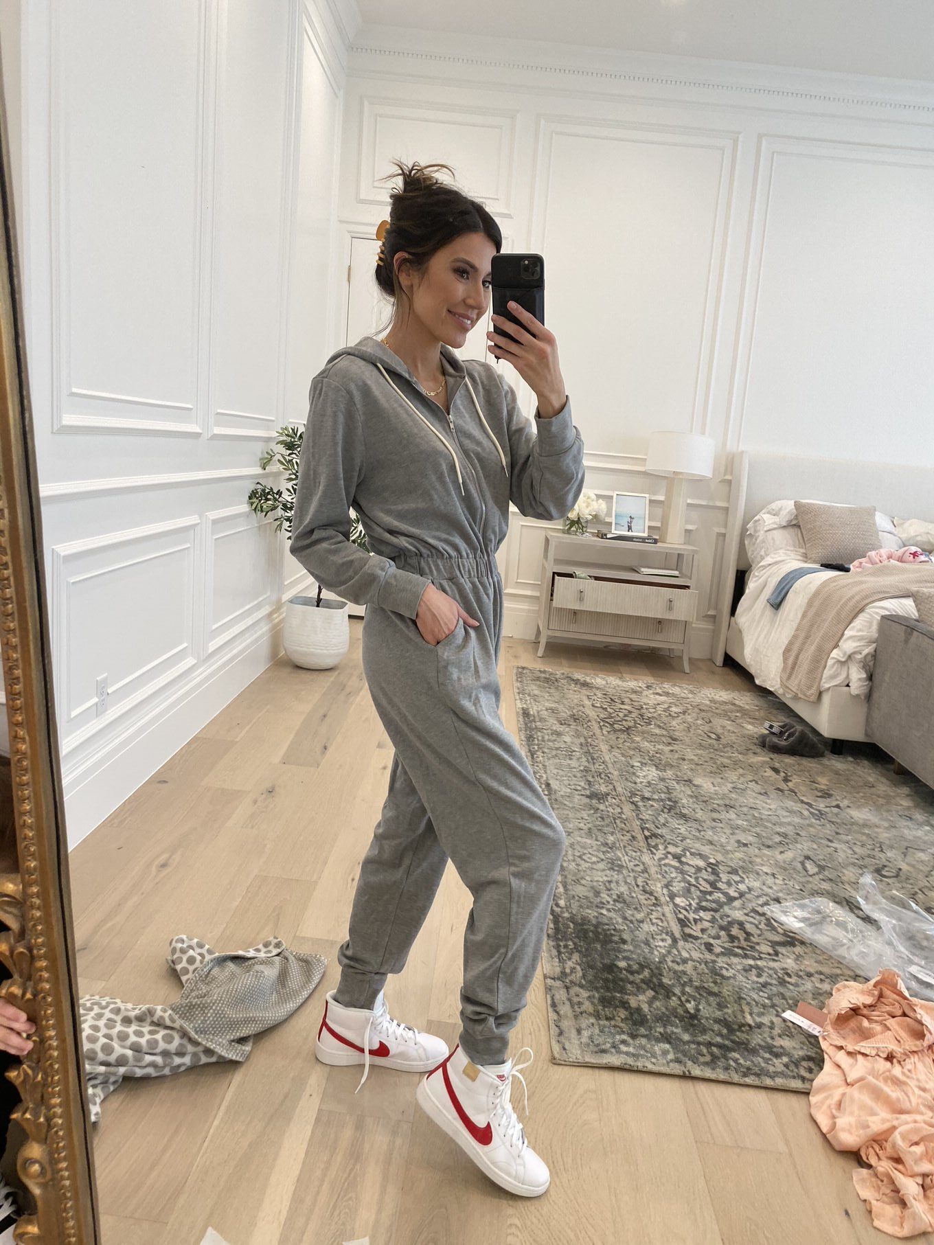 DETAILS: GREY SWEAT JUMPSUIT (WEARING SIZE S) | WHITE NIKE SNEAKERS (UNDER $100 – WEARING MEN’S SIZE 7) | HAIR CLIP