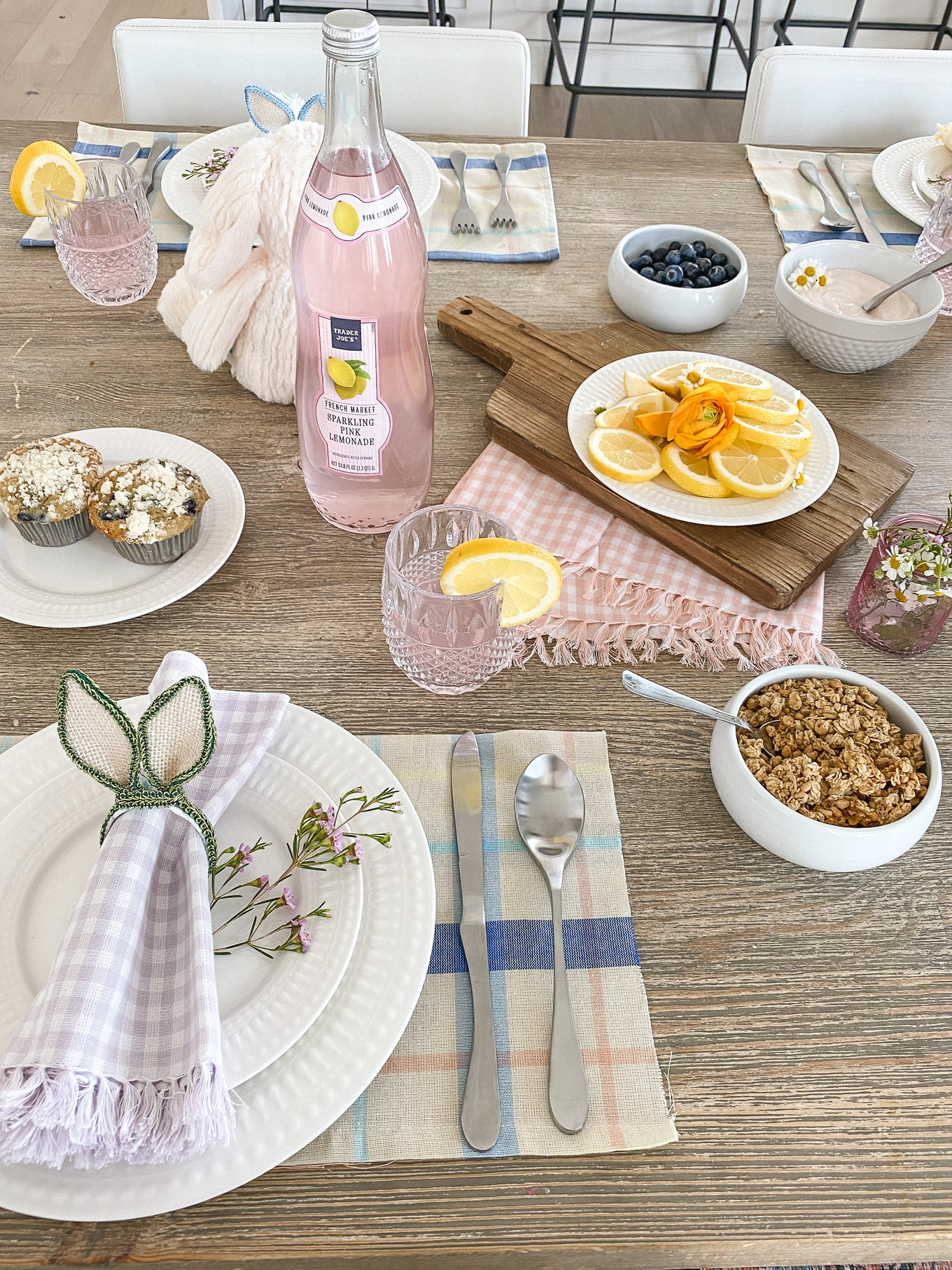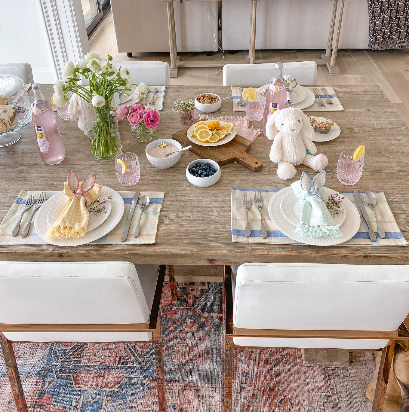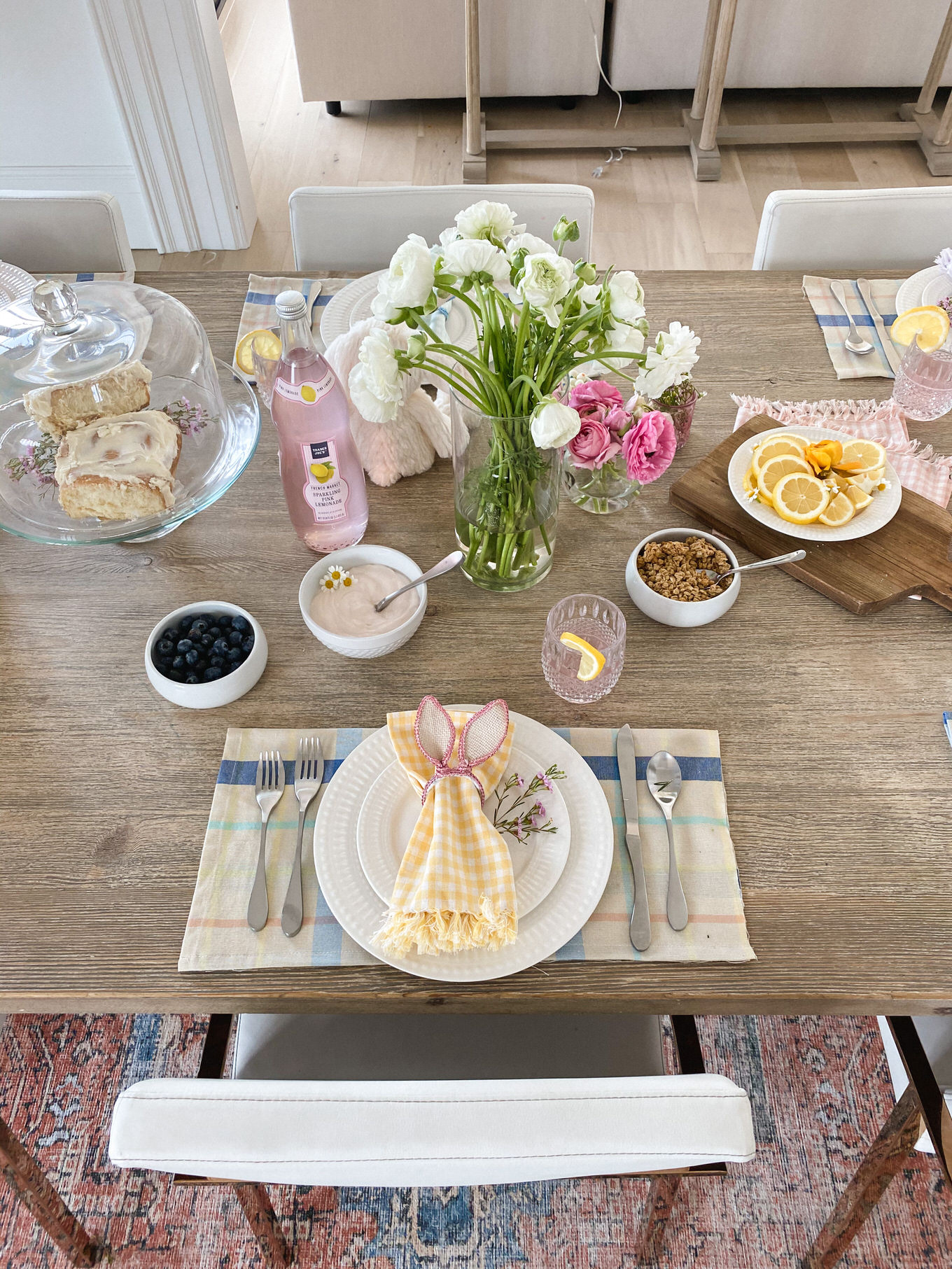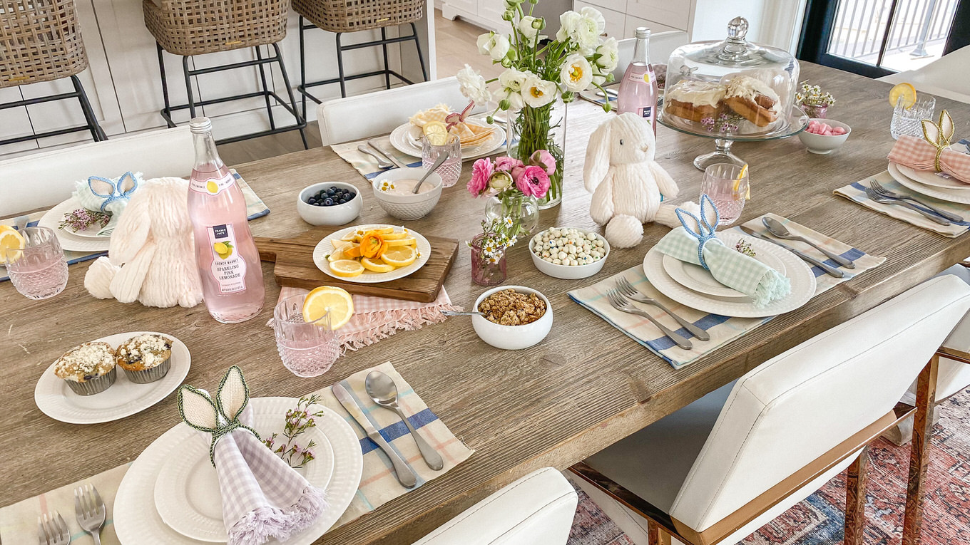 Adding a pretty vase of flowers is always a no brainer, but add little sprigs of flowers as accents to your plates or food. Wildflowers I feel like are such an underrated flower, and they add so much to a table. The little clusters look so cute as an accent to the bunny ears, and we pulled a couple mini daisies off to add to the lemon slices and yogurt and I love how it just adds that feminine touch :).