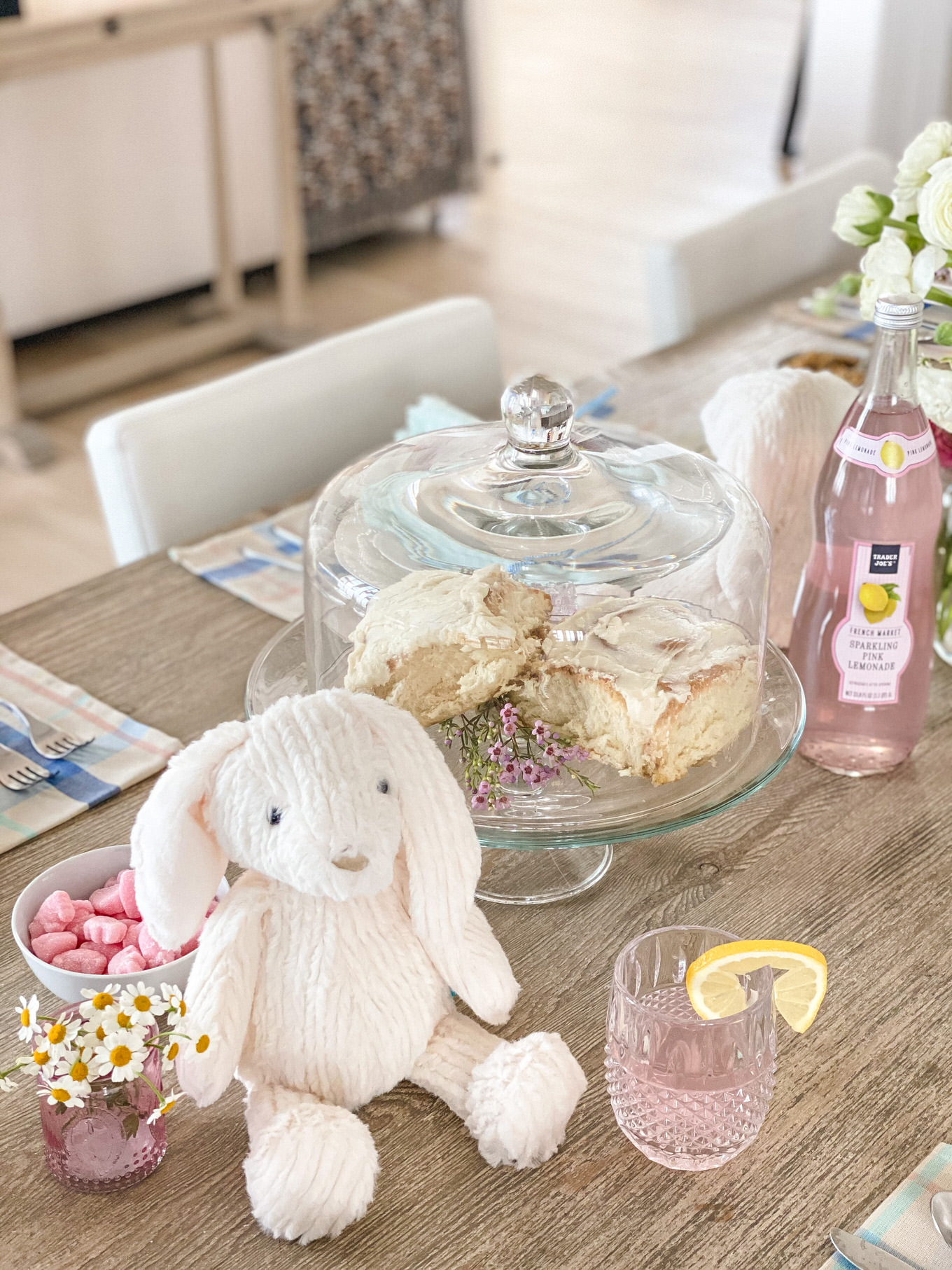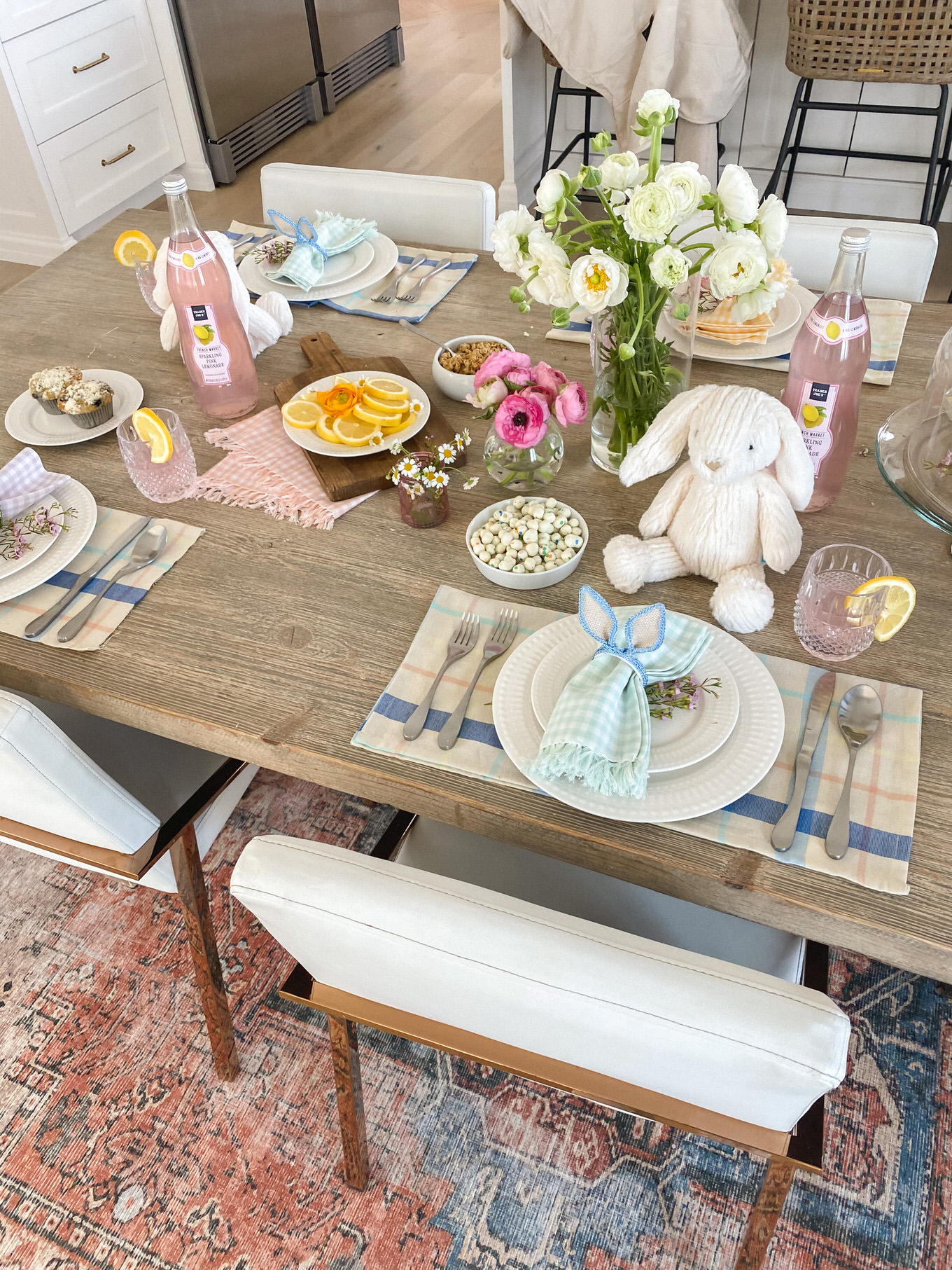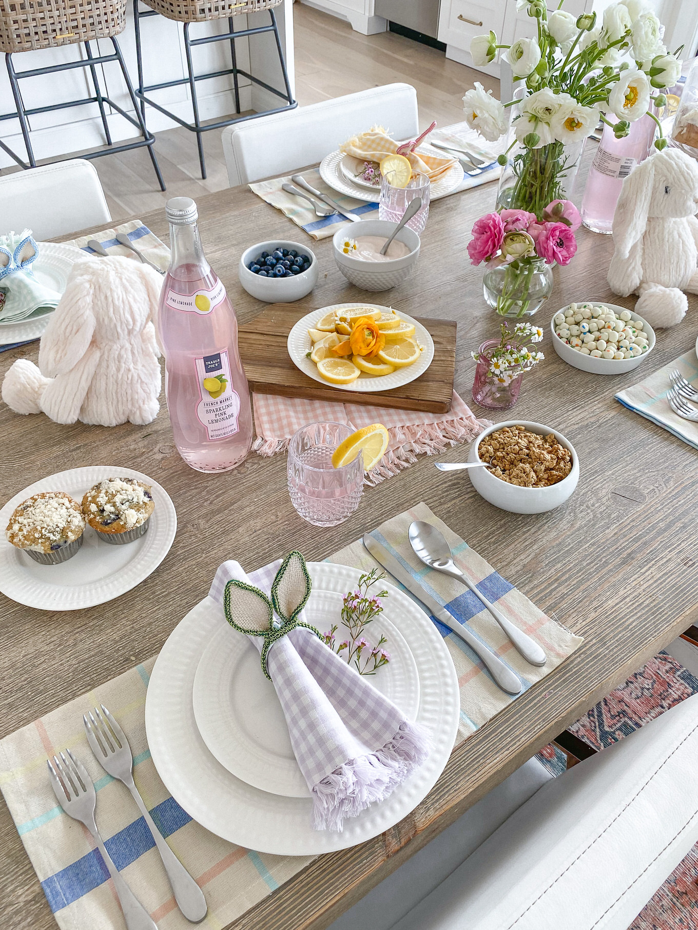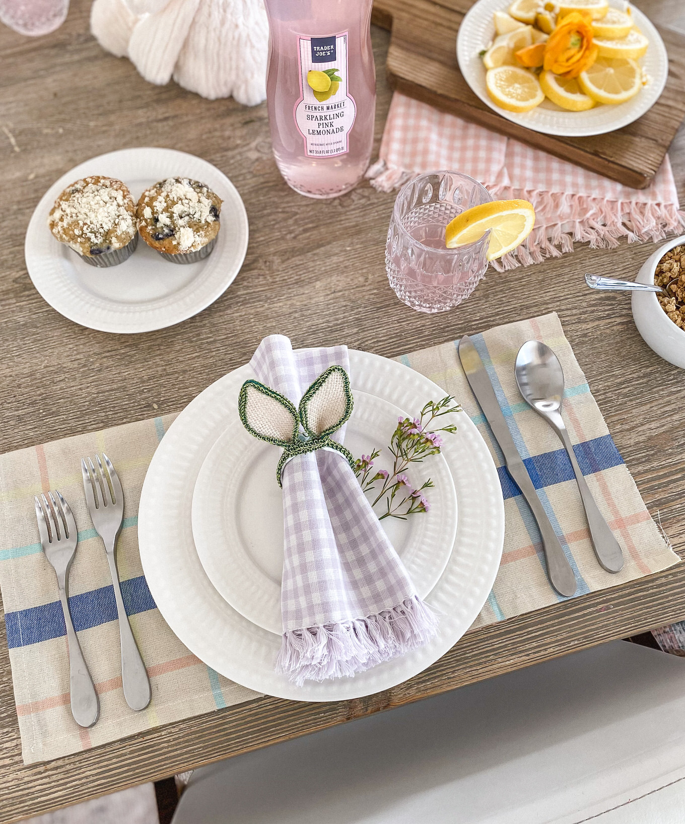 Adding a pretty vase of flowers is always a no brainer, but add little sprigs of flowers as accents to your plates or food. Wildflowers I feel like are such an underrated flower, and they add so much to a table. The little clusters look so cute as an accent to the bunny ears, and we pulled a couple mini daisies off to add to the lemon slices and yogurt and I love how it just adds that feminine touch :).