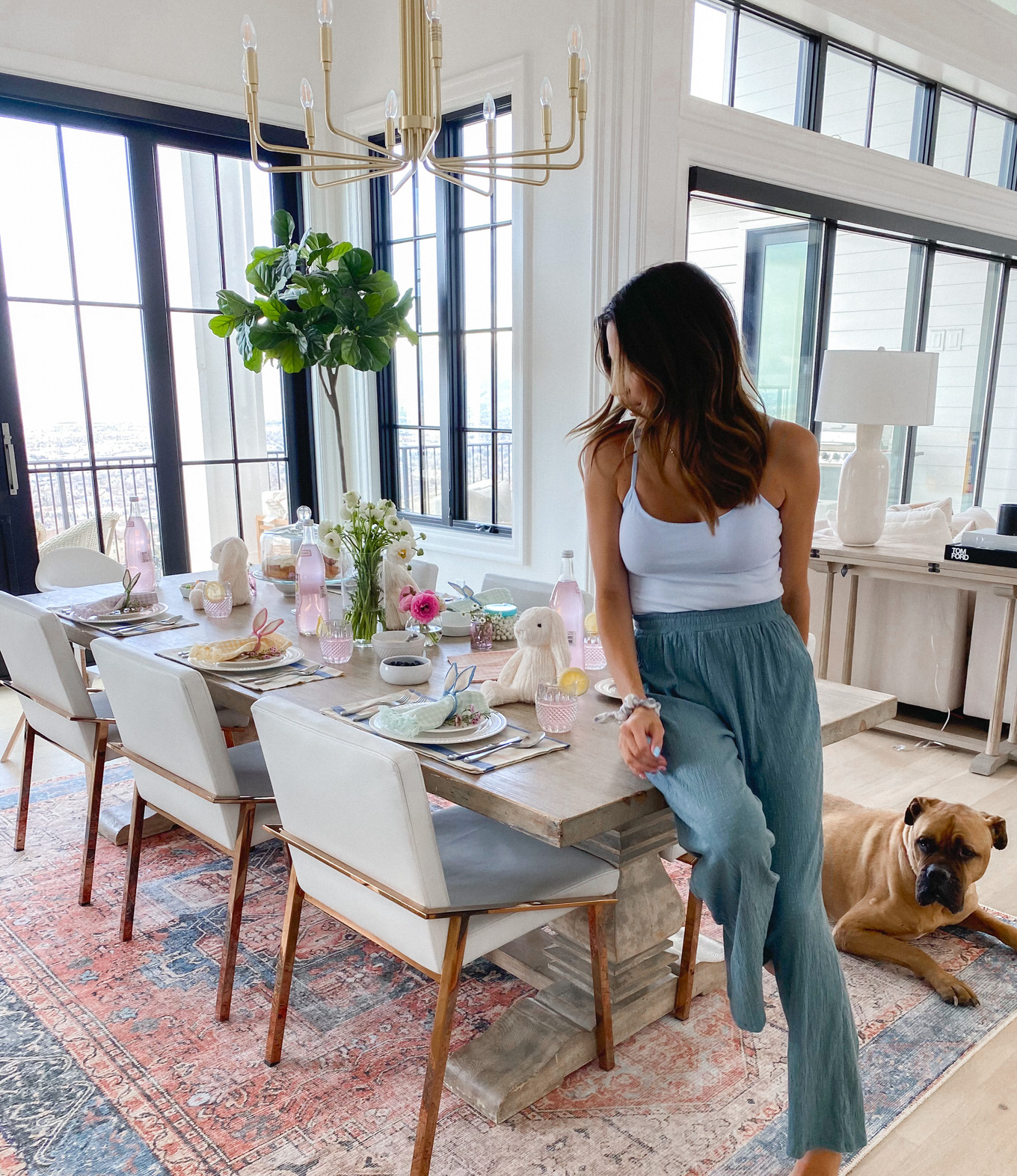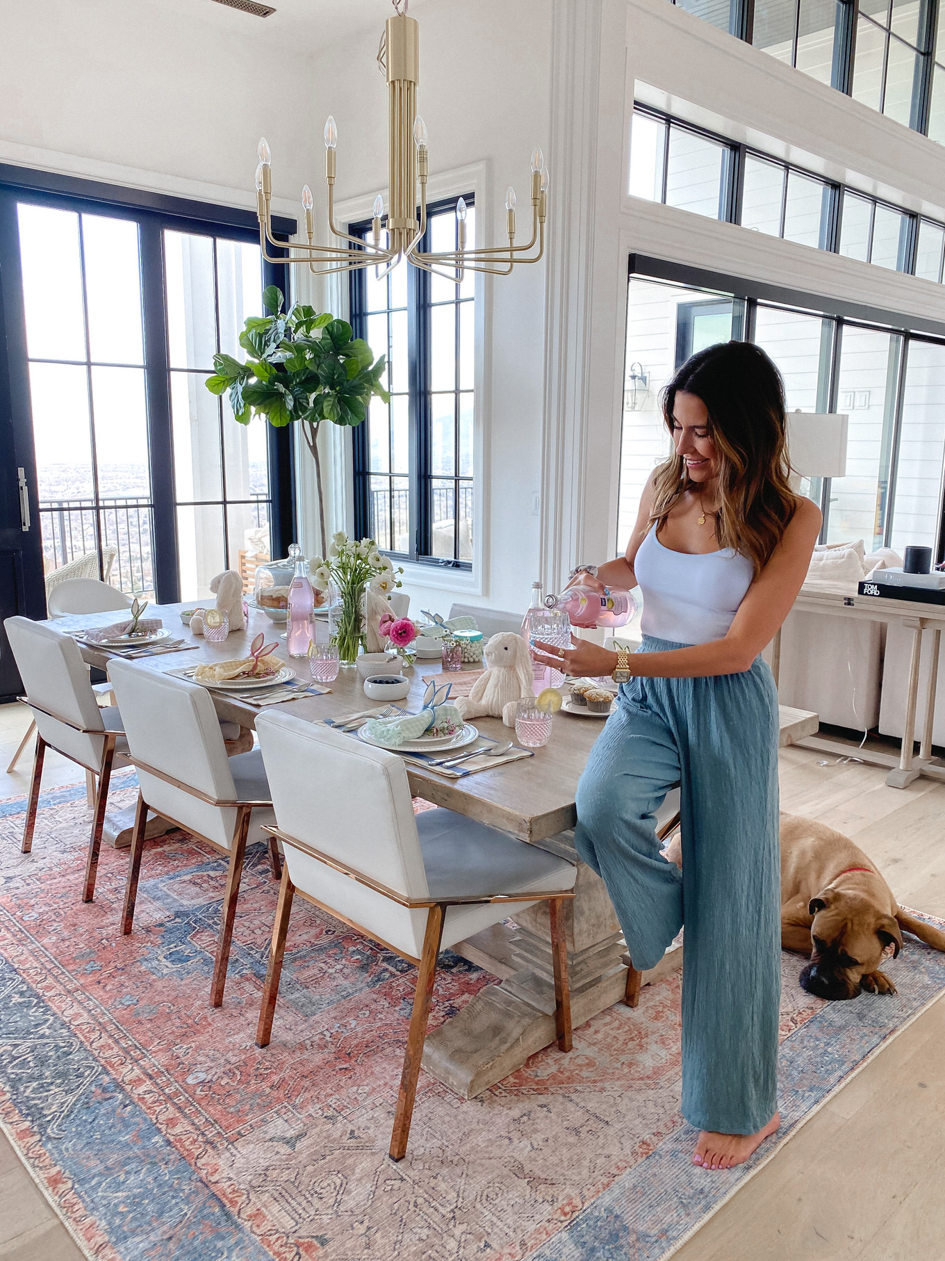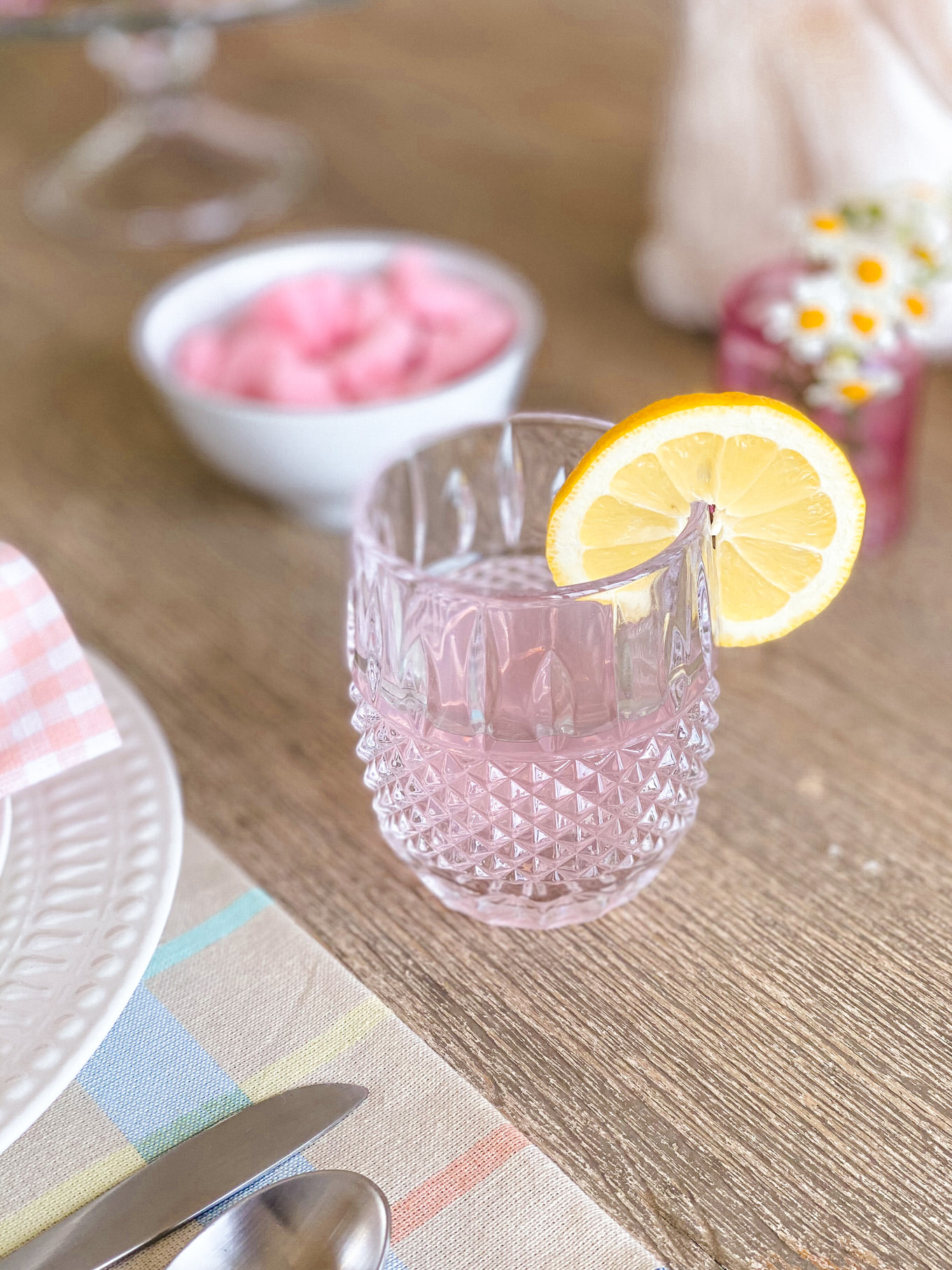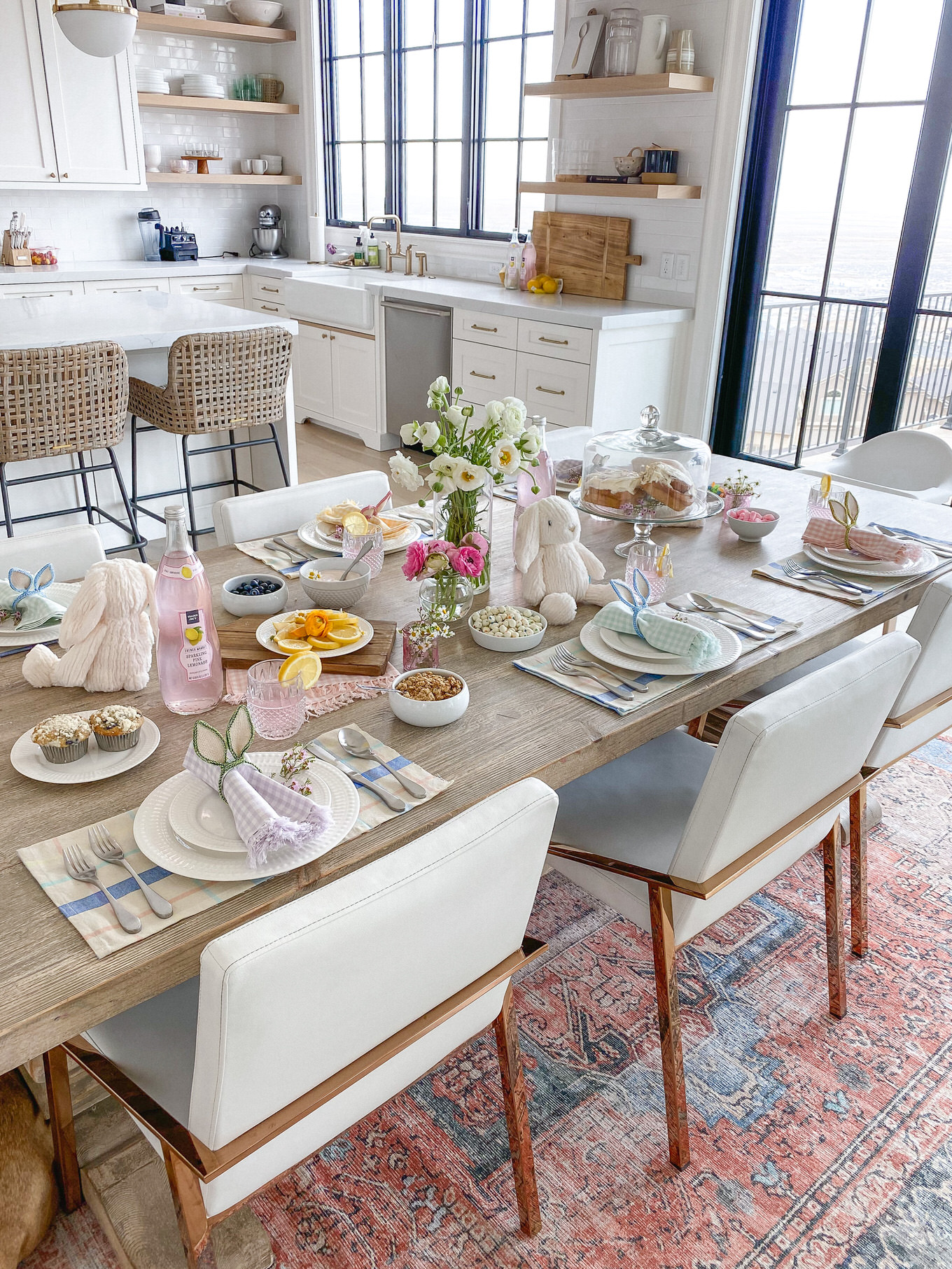 Adding a pretty vase of flowers is always a no brainer, but add little sprigs of flowers as accents to your plates or food. Wildflowers I feel like are such an underrated flower, and they add so much to a table. The little clusters look so cute as an accent to the bunny ears, and we pulled a couple mini daisies off to add to the lemon slices and yogurt and I love how it just adds that feminine touch :).