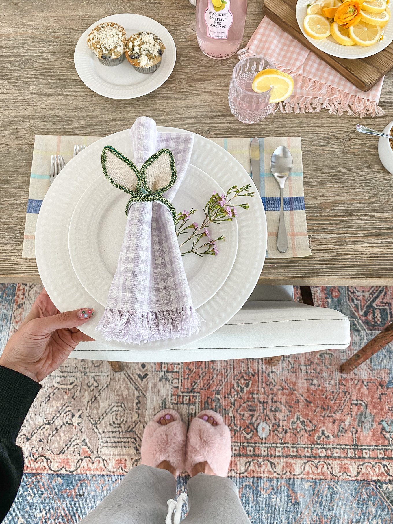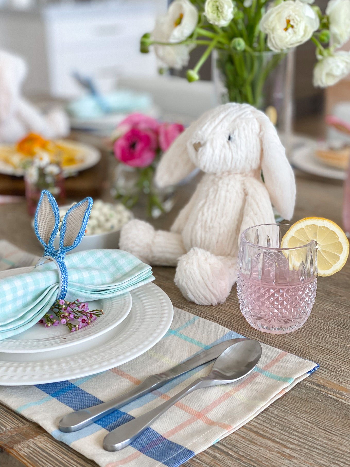 Spring is the best opportunity to buy sets in multiple colors, making it the perfect time to mix and match your decor for a perfectly mismatched tablescape. I got these gingham napkins that come in a pretty lavender, blush, mint, and blue and also these cute bunny ear napkin rings that the kids loved. Instead of matching them up for each place setting, I mixed it up so there was even more color at each seat.