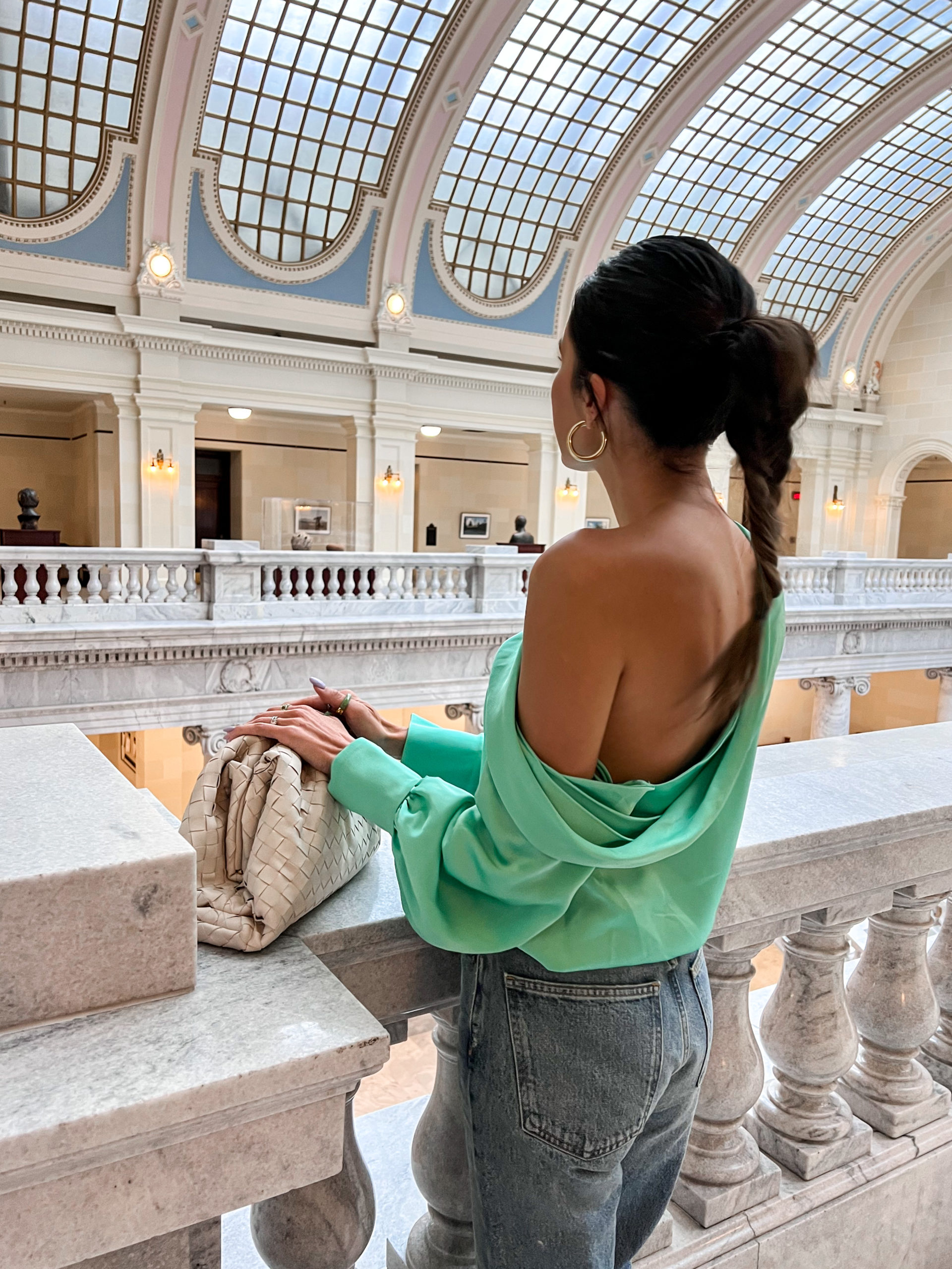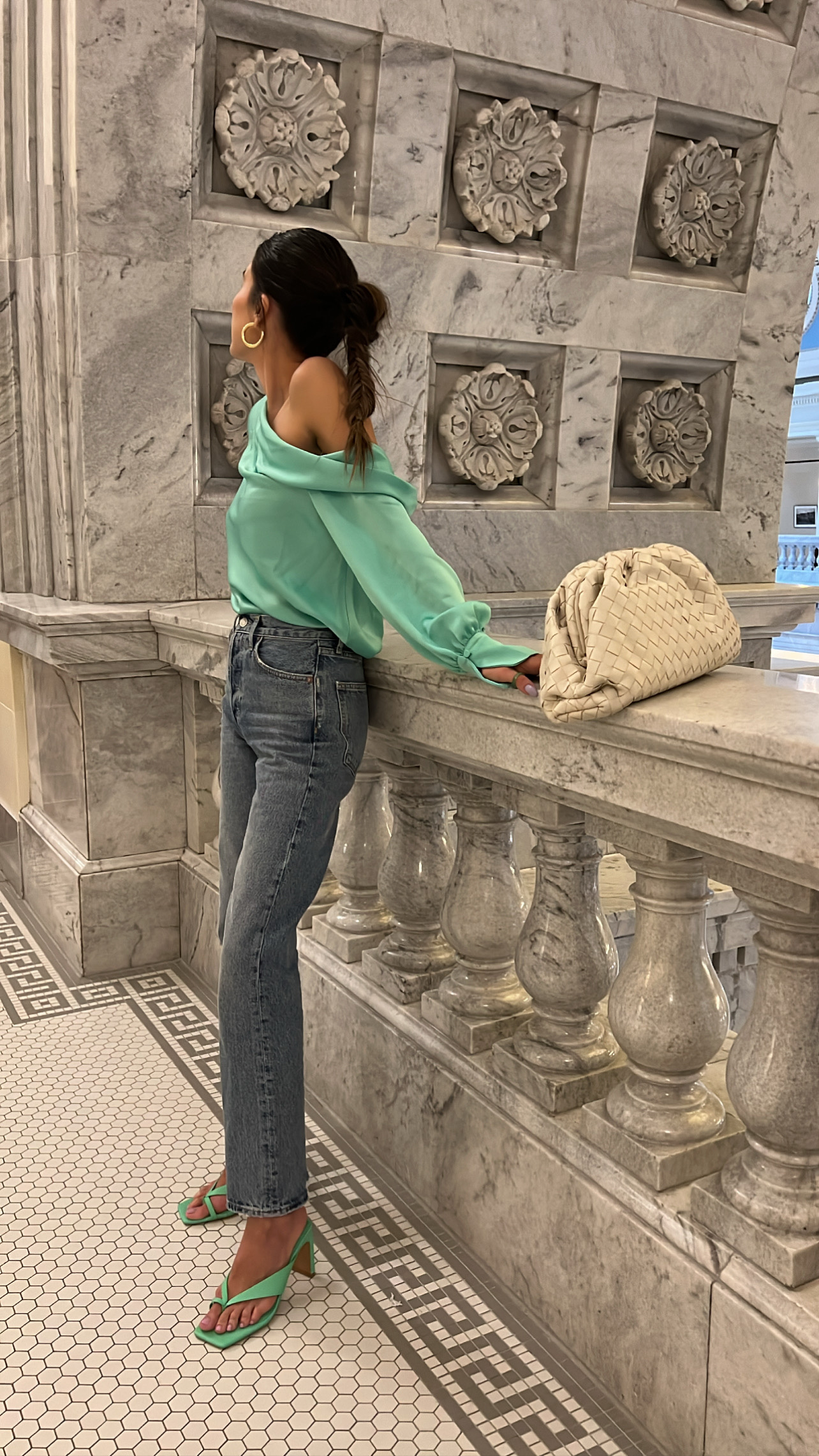 DETAILS: GREEN OFF THE SHOULDER BLOUSE (WEARING SIZE S) | DENIM (WEARING SIZE 25) | GREEN SANDALS (WEARING SIZE 8)| WOVEN POUCH (ALSO LOVE THIS WOVEN BAG)